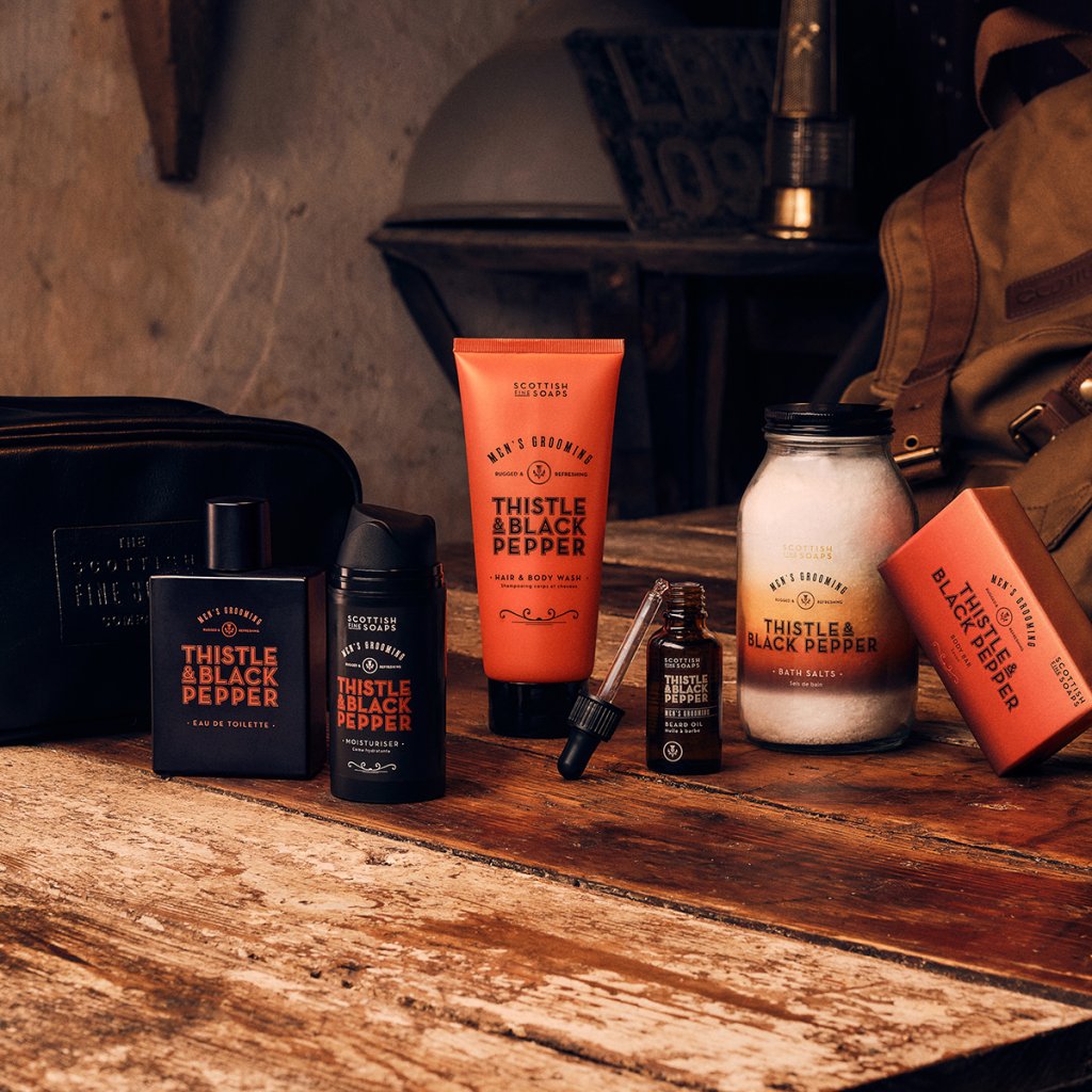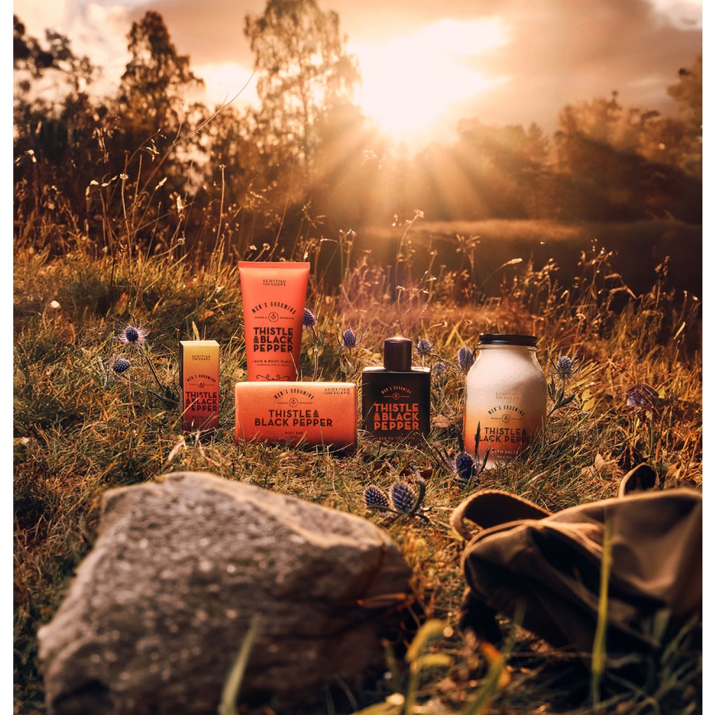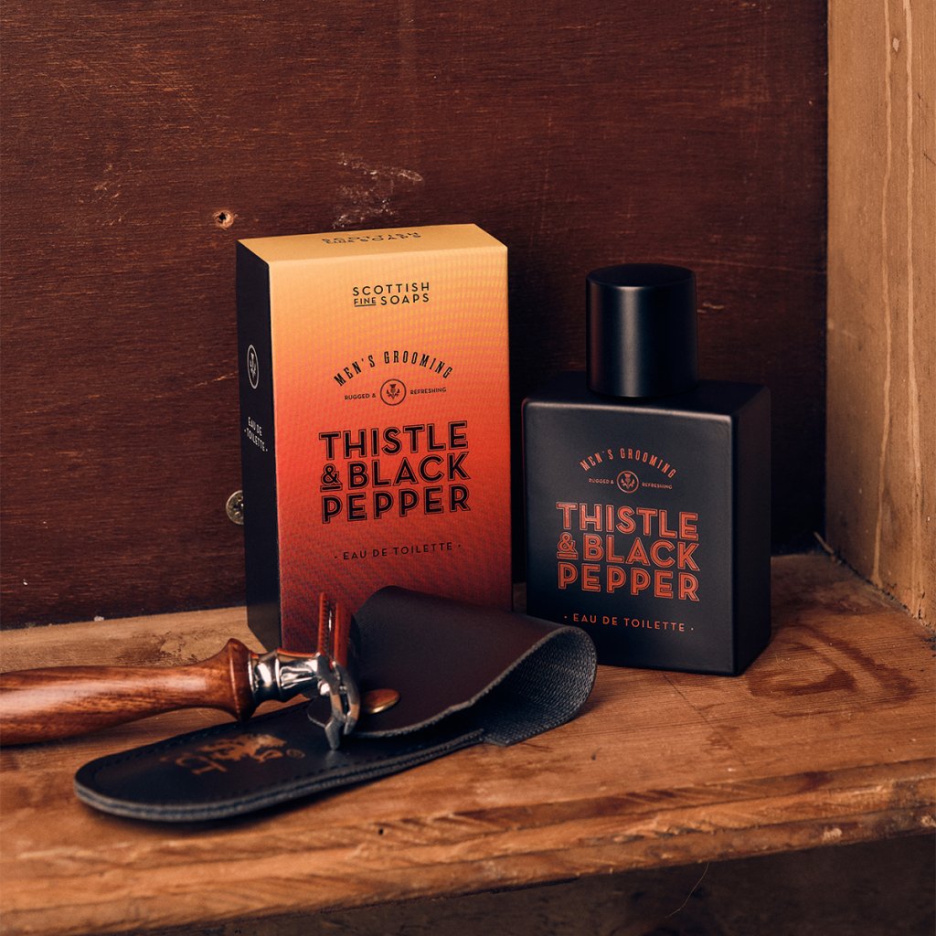 Apa de toaletă pentru bărbați Thistle & Black Pepper își deschide compoziția cu note proaspete de citrice, ierburi, cătină și piper negru, care trezesc imediat simțurile. În inima parfumului înfloresc acorduri florale de trandafir, geraniu, lăcrămioare și lavandă, care aduc un contrast delicat cu baza expresivă. Aceasta este formată din note calde de whisky, ambră, lemn de santal, mosc, boabe de tonka și mușchi, care lasă o urmă masculină pe piele.