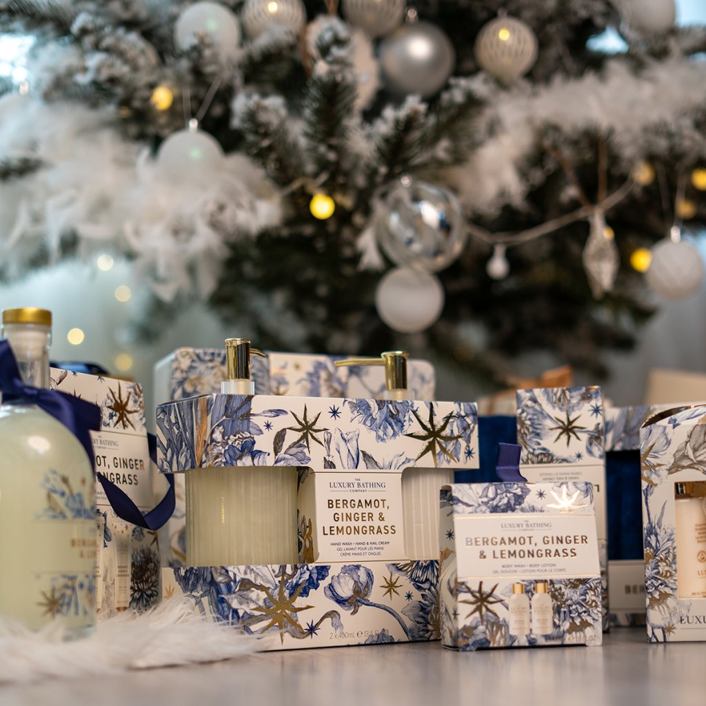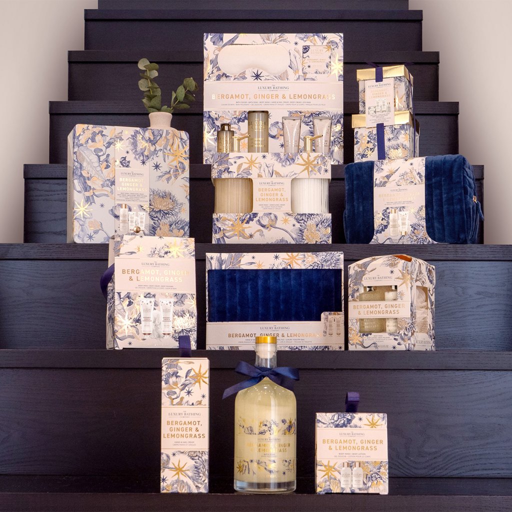 Colecția elegantă Bergamot, Ghimbir & Lemongrass combină designul rafinat cu detalii festive delicate în tonuri aurii, bleumarin și crem. Produsele de îngrijire sunt însoțite de un parfum luxos și intens cu tonuri proaspete de bergamotă, lemongrass și ghimbir, completate de tonuri de flori, ambră și mosc. Colecția este concepută pentru femei și bărbați peste 40 de ani, care apreciază calitatea și luxul.