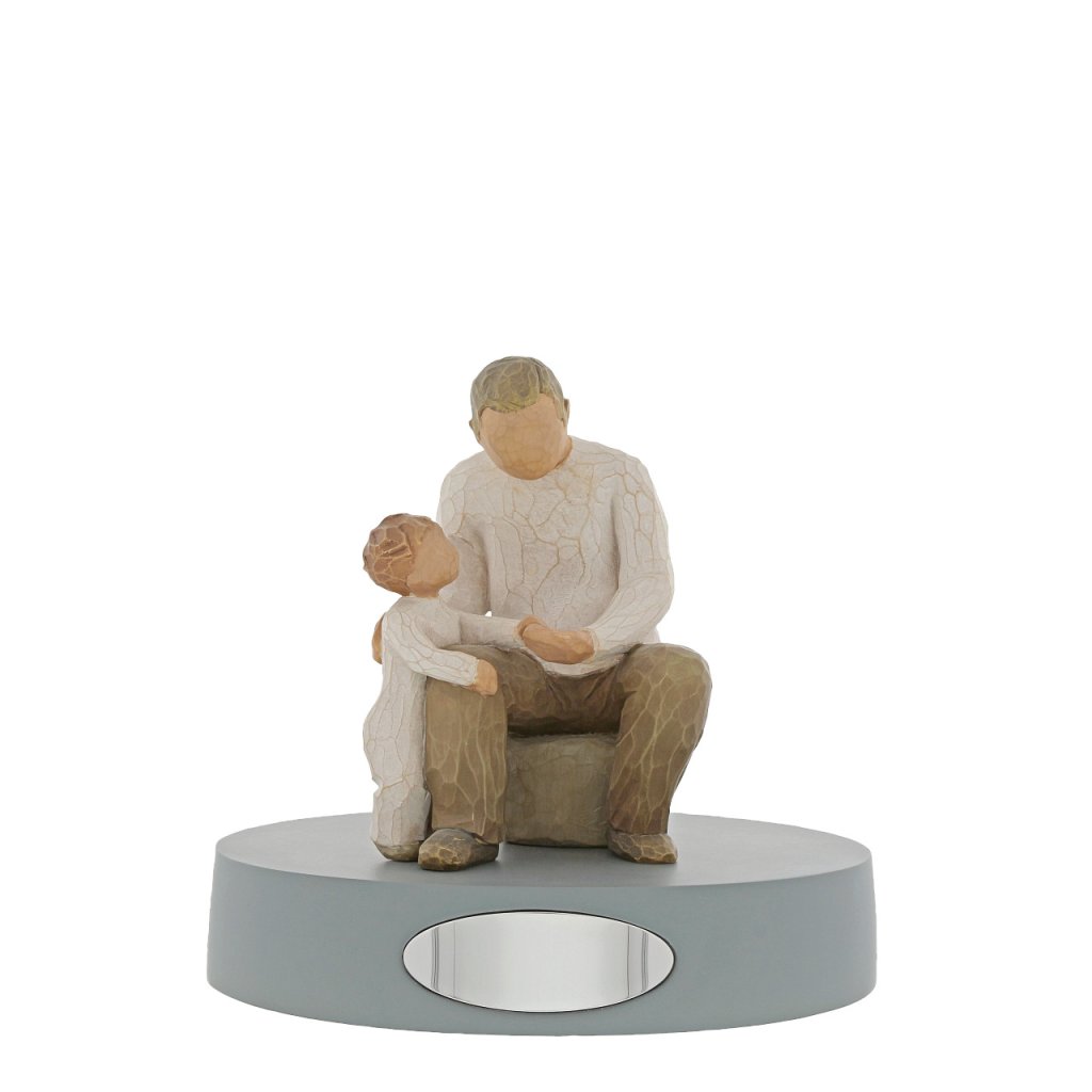 O figurină a unui bărbat în vârstă așezat, cu un copil mic.