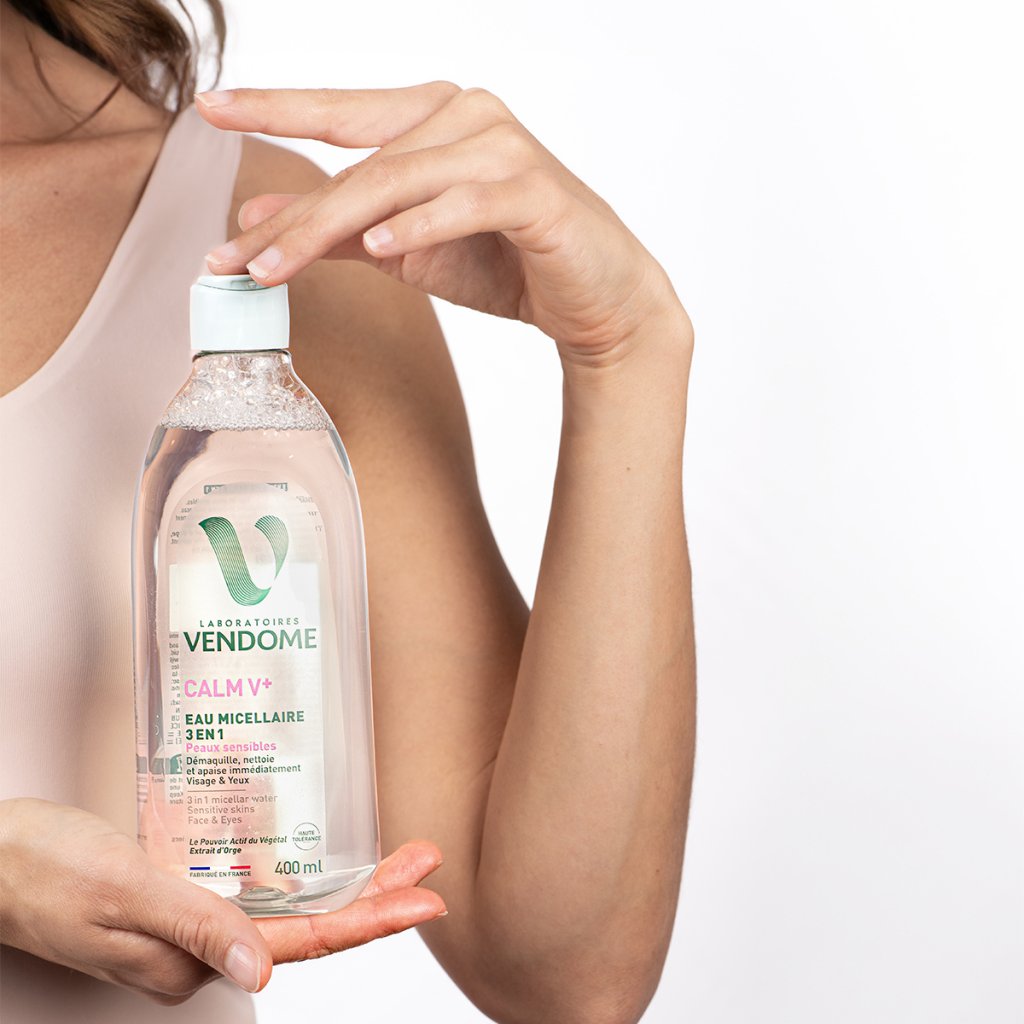 Curățarea zilnică a pielii poate fi eficientă și, în același timp, extrem de delicată. Apa micelară 3 în 1 Vendome CALM V+ a fost dezvoltată special pentru nevoile pielii sensibile – îndepărtează delicat machiajul, curăță eficient și calmează imediat pielea. Textura sa ușoară și revigorantă nu îngreunează pielea și nu lasă o peliculă grasă.