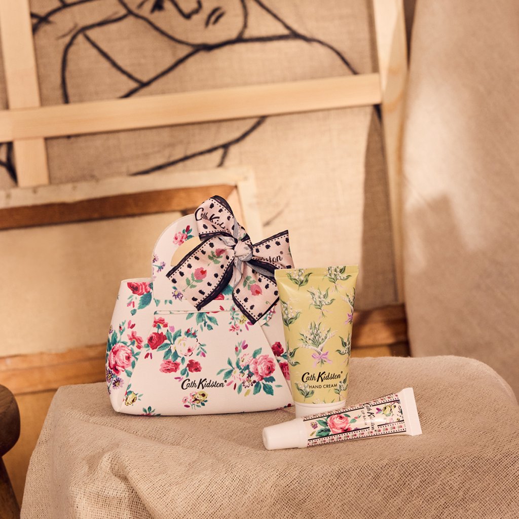 Descoperiți un set cadou frumos cu cremă de mâini și balsam de buze, ascuns într-o mini geantă cu motive florale vintage de la designerul Cath Kidston.