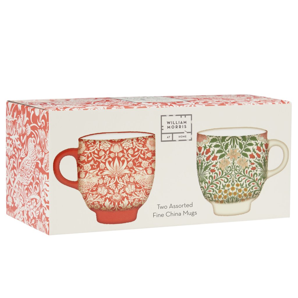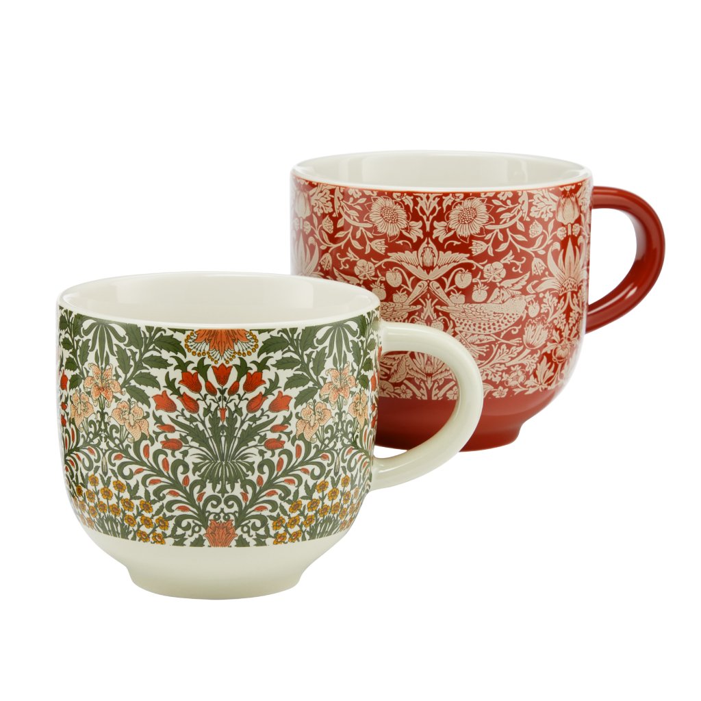 Două căni frumoase, una este în culoarea de teracotă cu imprimeu Strawberry Theif și cealaltă de culoare verde cu imprimeu Garden, care vor arăta minunat în orice casă.