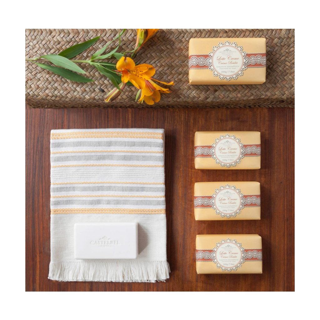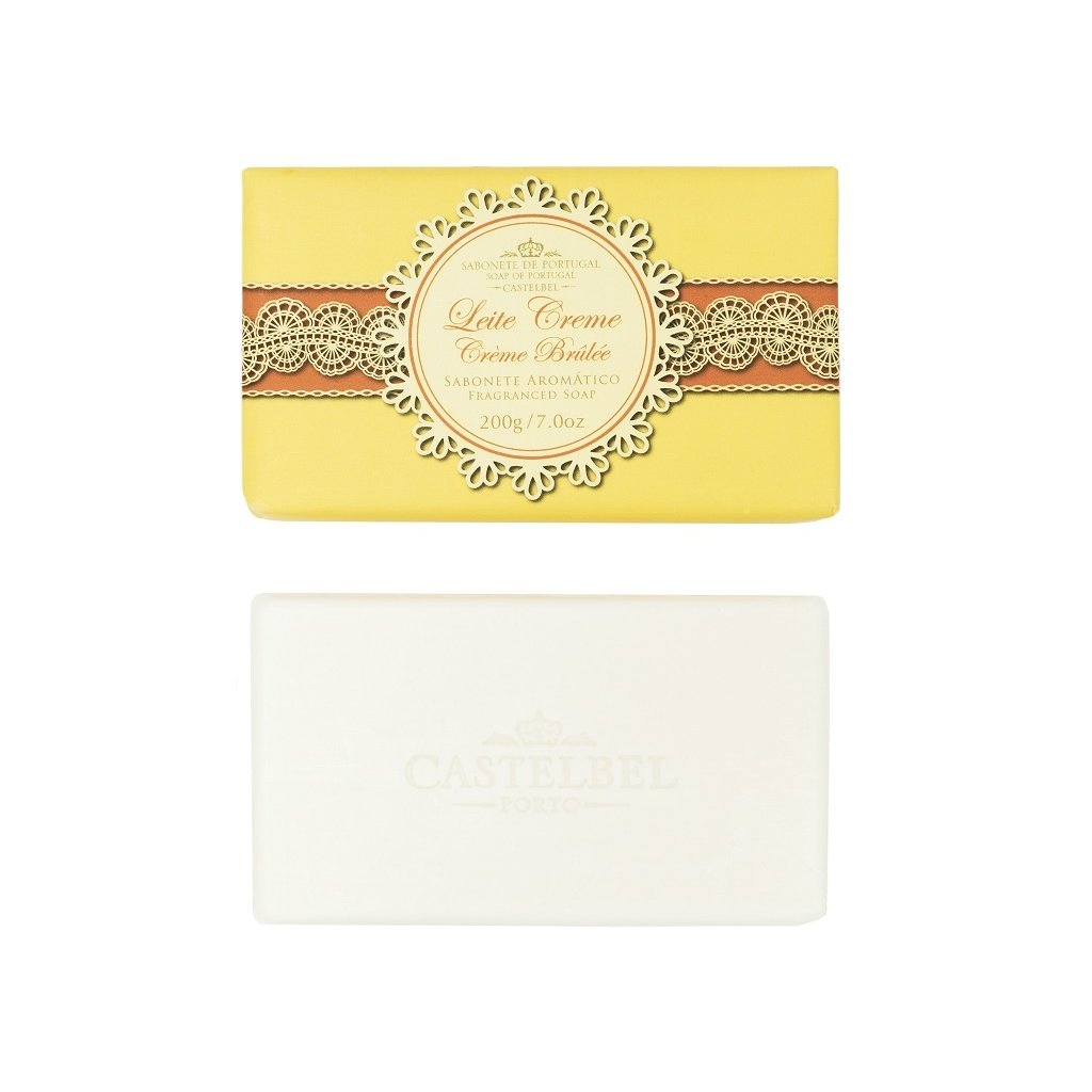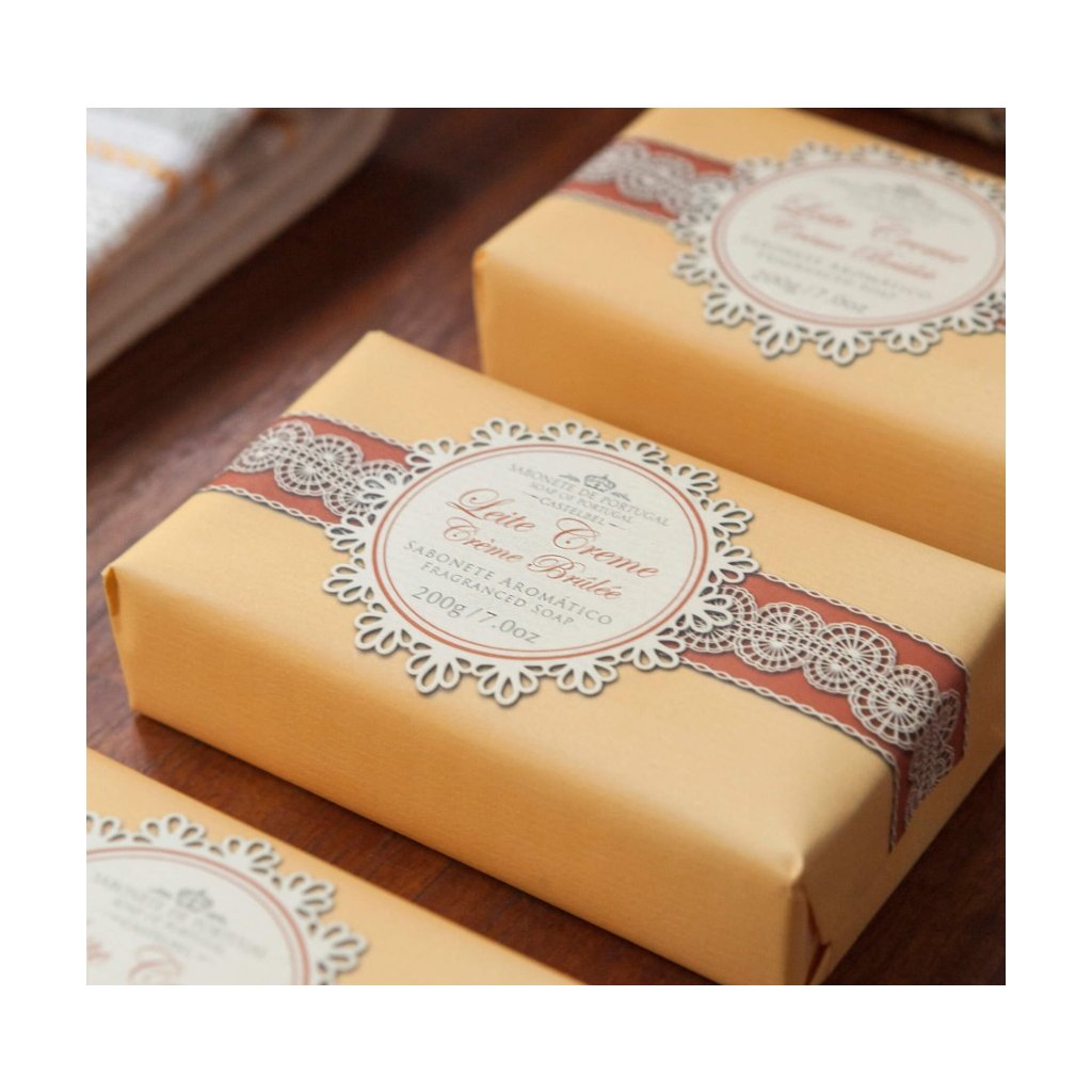 Săpun fin de lux cu parfum gourmet de desert dulce Créme Brulée, care amestecă arome de lapte, caramel și vanilie. Acest săpun este de înaltă calitate, hidratează, nu usucă pielea și face multă spumă. Este ambalat într-un ambalaj elegant de hârtie cu motiv de dantelă.