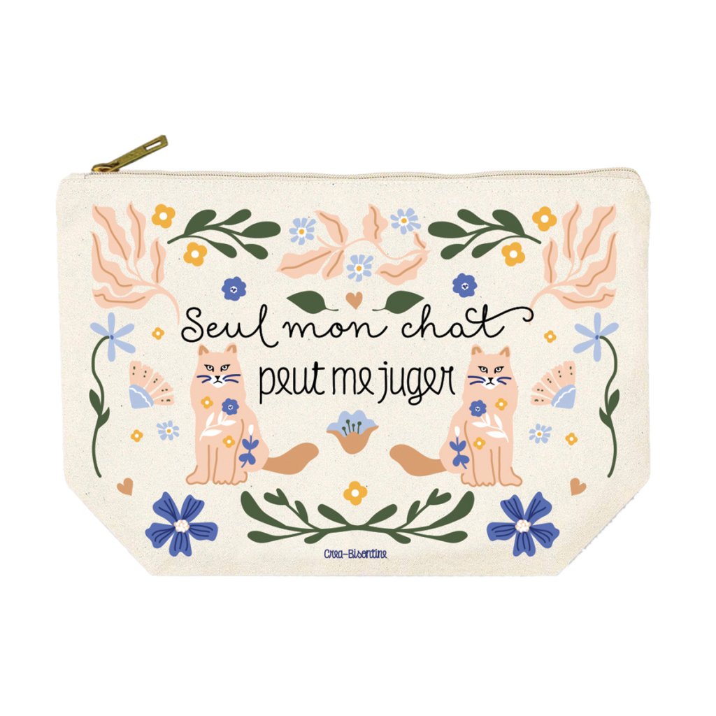 Această trusă mare de cosmetice din bumbac, cu inscripția „Seul mon chat peut me juger” („Doar pisica mea mă poate judeca”), este un accesoriu elegant pentru cosmeticele și îngrijirea ta zilnică. Ilustrația originală a Créa Bisontine combină motivul pisicii cu detalii delicate de flori, creând astfel un design original pe care îl vei iubi!