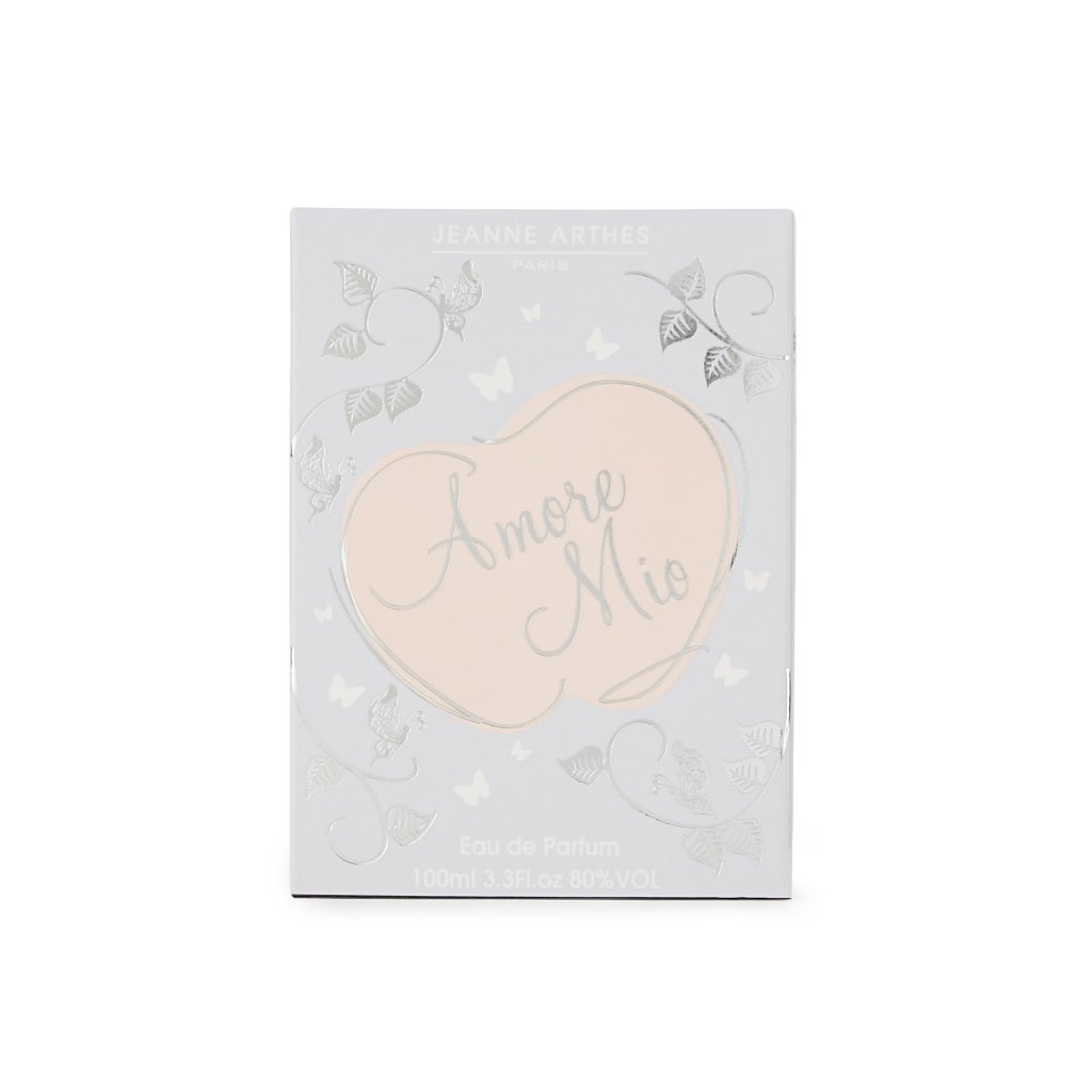 - Sticla: Sticla de parfum Amore Mio are forma unui măr și este fabricată din sticlă mată fină, de culoare roz. Este decorată cu un relief argintiu de fluturi și flori, care adaugă un aspect romantic și feminin. Capacul argintiu este stilizat sub forma unui șarpe, ceea ce adaugă un element unic și sofisticat.