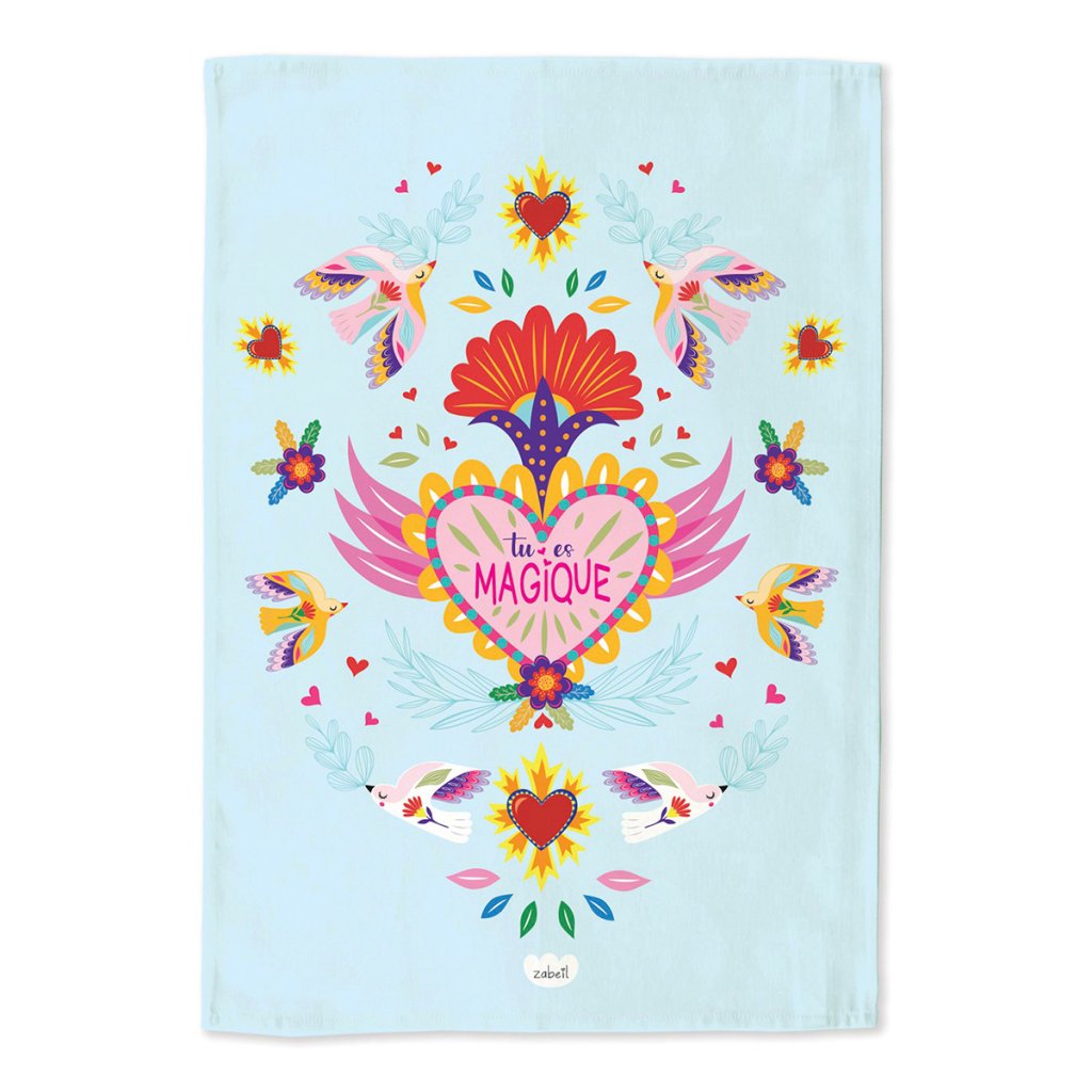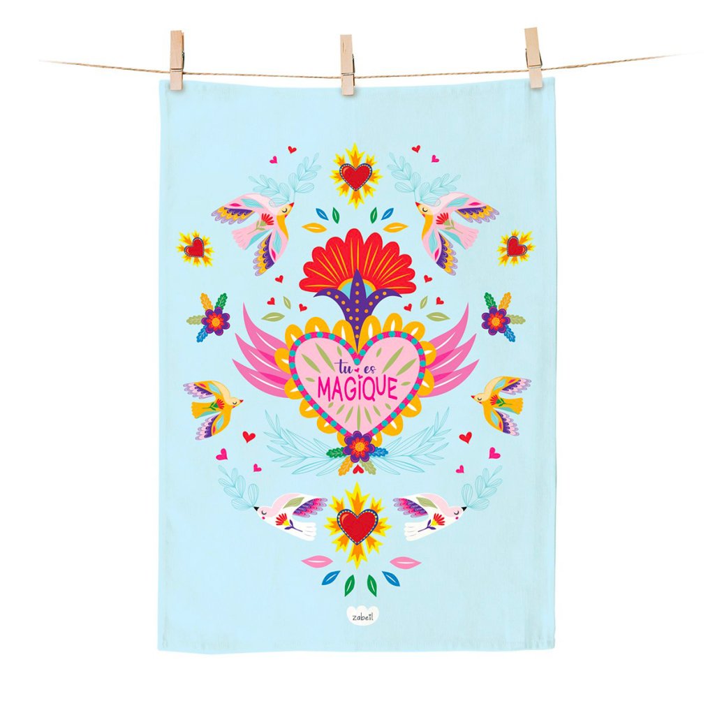 Un prosop de bucătărie elegant, cu un motiv distinctiv în stilul tipic al ilustratoarei Zabeil, va anima orice bucătărie. Designul cu păsări, inimă și inscripția „Tu es magique” („Ești magică”) conferă textilei o notă jucăușă și pozitivă – pentru că chiar și un prosop obișnuit poate avea stil.