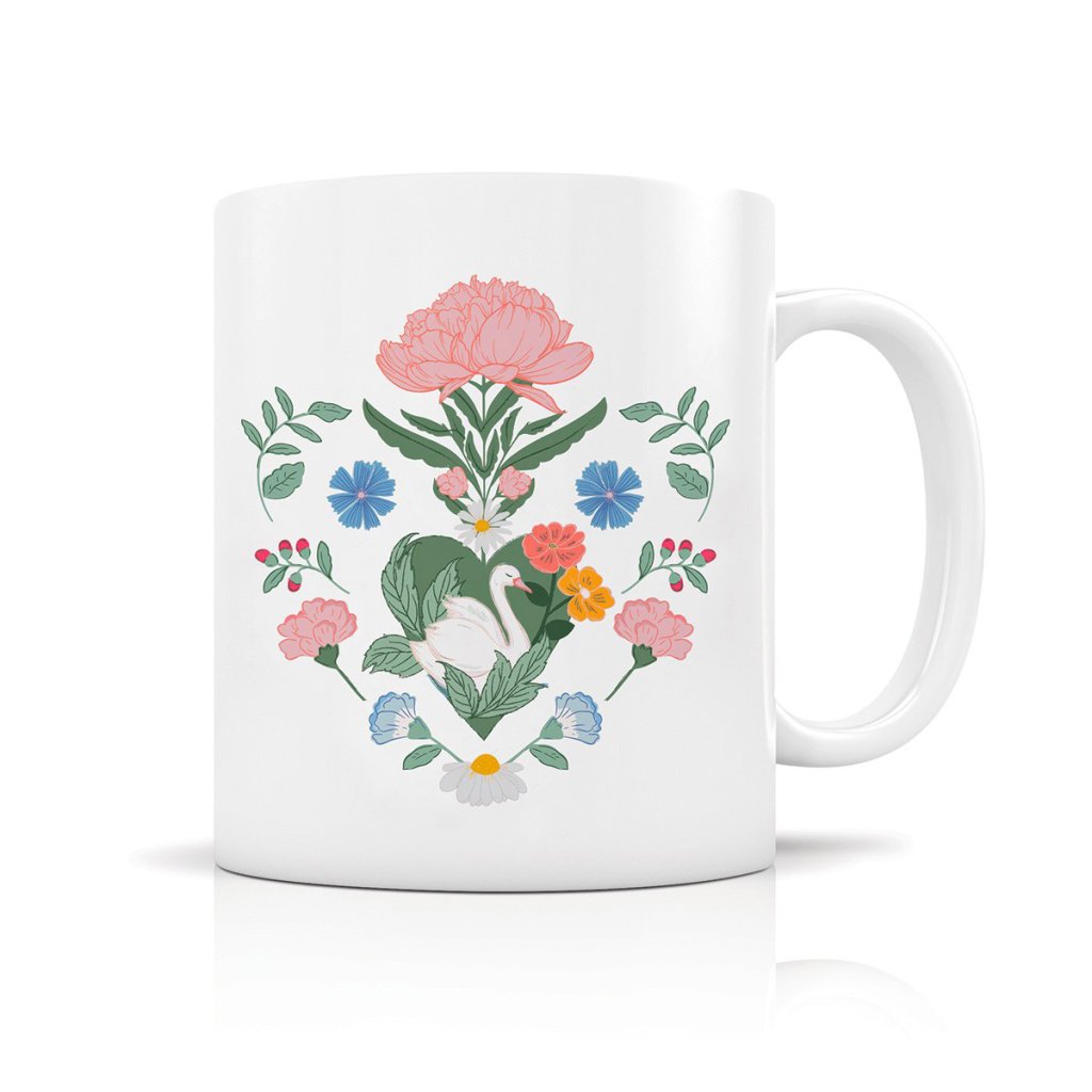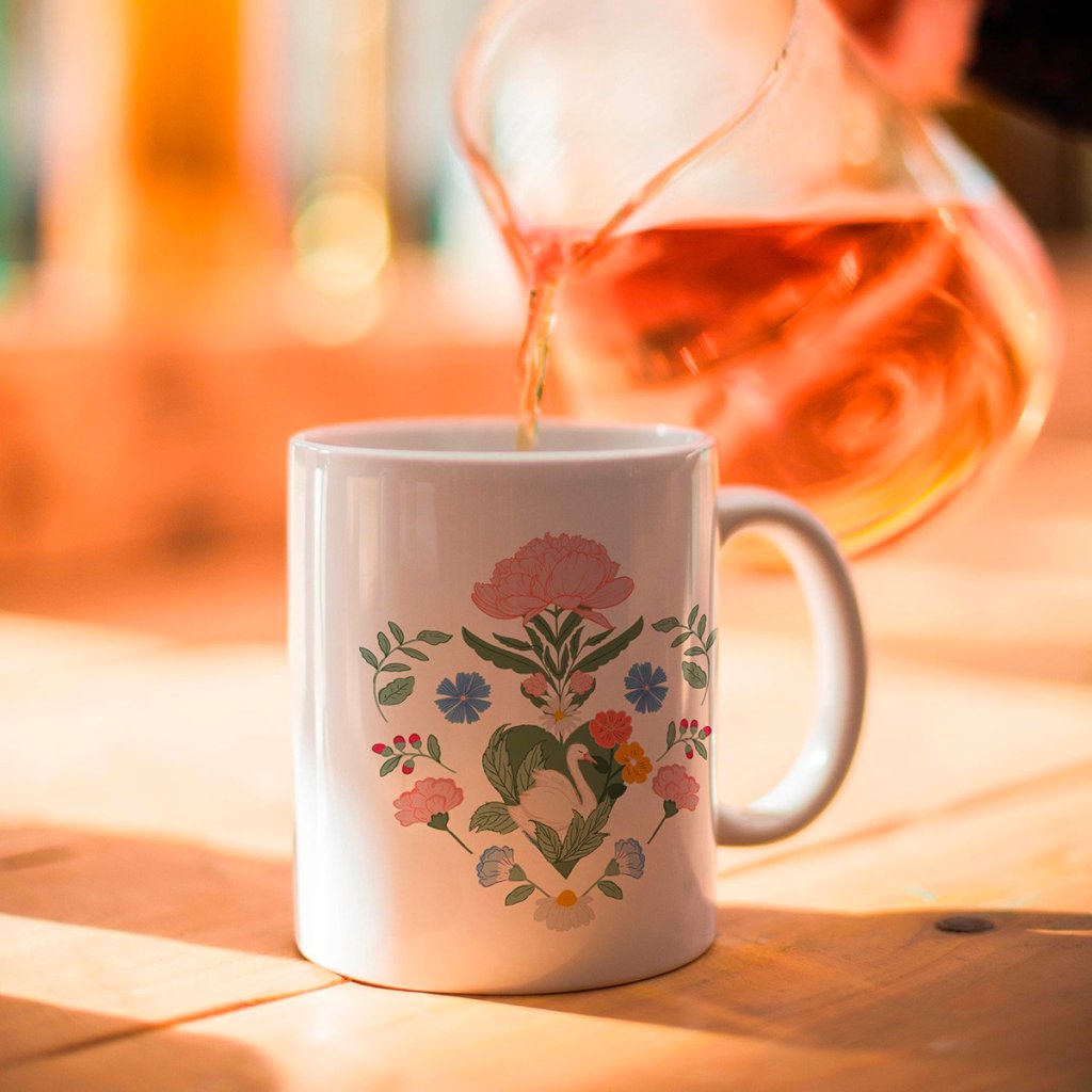 Colecția preferată, care luminează fiecare zi. Cană de designer de la marca Hirondelles & Cie este decorată cu un motiv de lebădă și flori. Ilustrația originală Créa Bisontine combină flori, elemente naturale și culori armonioase într-un design elegant, atemporal.