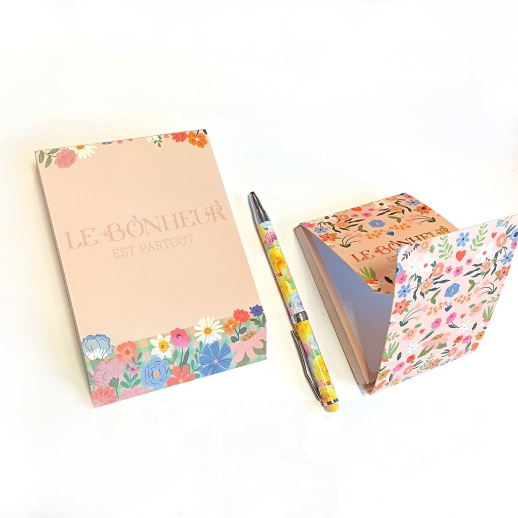 Paginile blocului sunt decorate cu o ilustrație originală cu motiv floral și inscripția discretă „Fericirea este peste tot". Datorită acestui lucru, blocul nu pare doar funcțional, ci și decorativ și va arăta frumos pe birou.