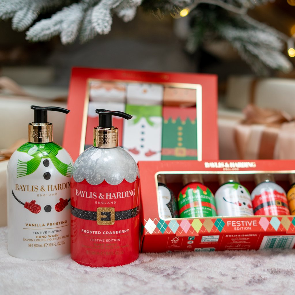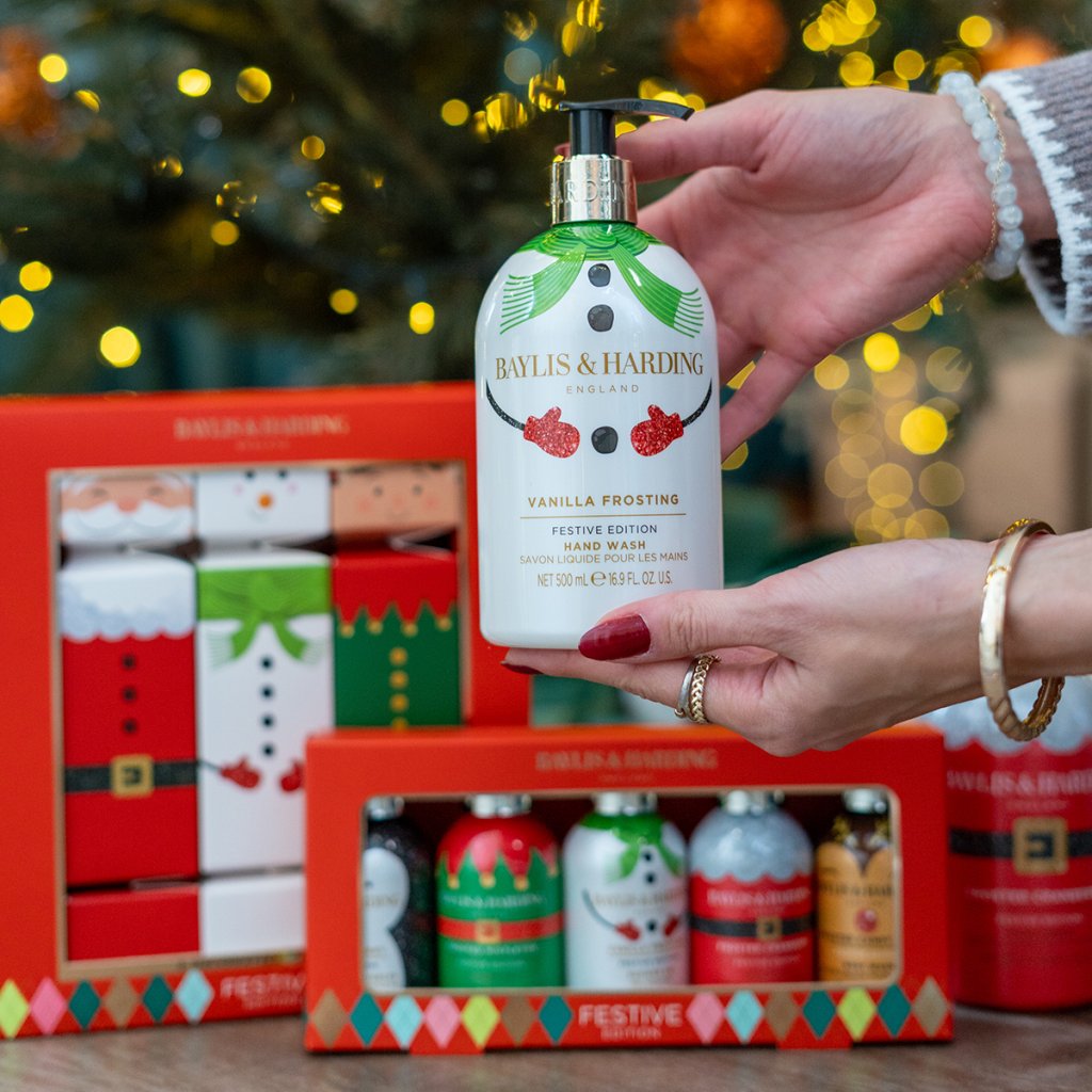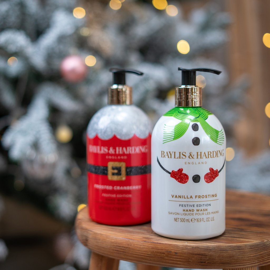 Răsfățați-vă mâinile la fiecare spălare cu săpunul de mâini hrănitor din colecția de Crăciun Baylis & Harding!