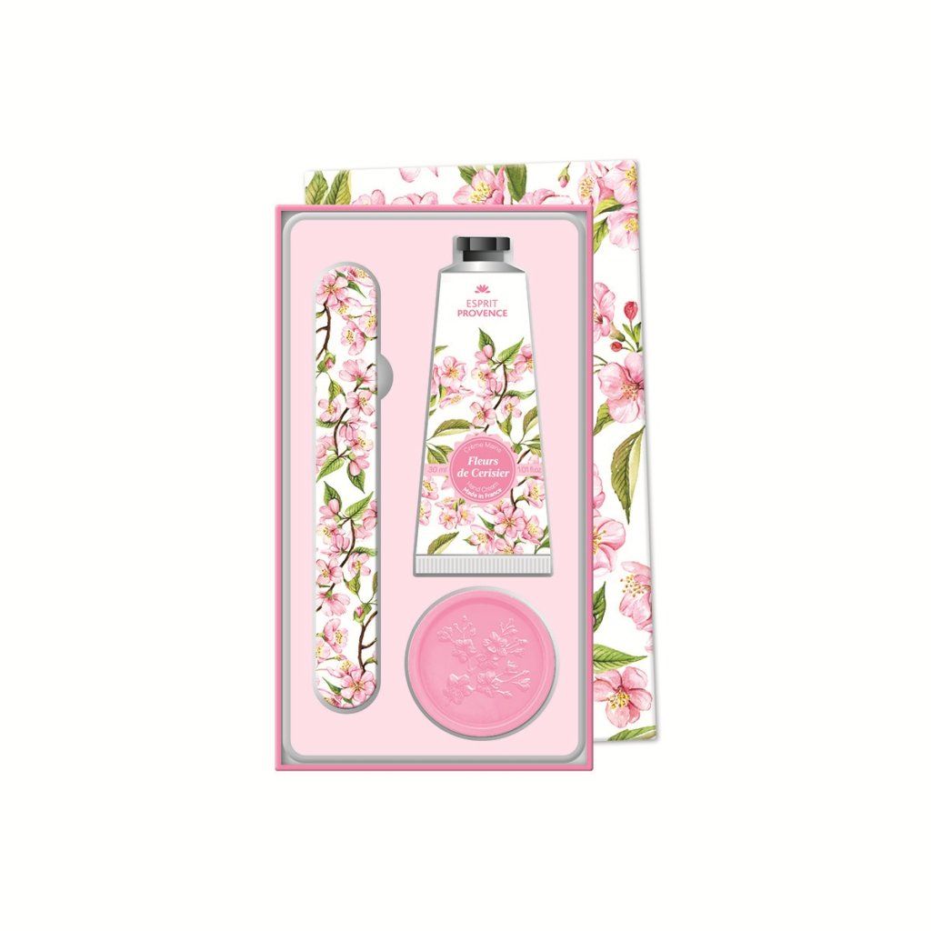 Un elegant set cadou pentru îngrijirea mâinilor de la brandul Esprit Provence, cu o delicată aromă de floare de cireș, reprezintă un cadou ideal și un companion practic pentru îngrijirea zilnică a mâinilor. Setul conține tot ce este necesar pentru mâini curate, hidratate și îngrijite – o cremă de mâini, un săpun solid și o pilă de unghii într-un format compact, potrivit și pentru călătorii.