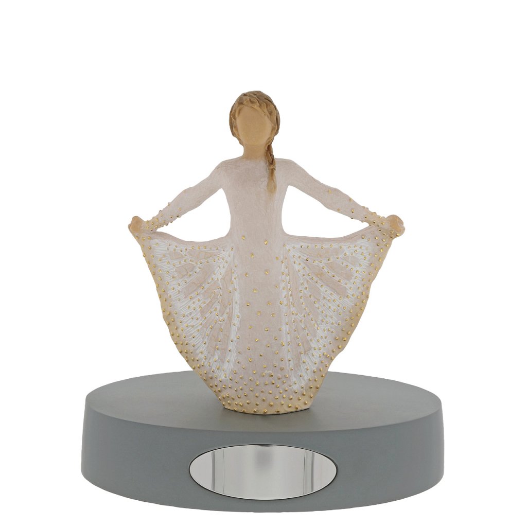 - Statueta este fabricată din rășină artificială care imită aspectul lemnului sculptat și este pictată manual cu vopsea fără plumb.