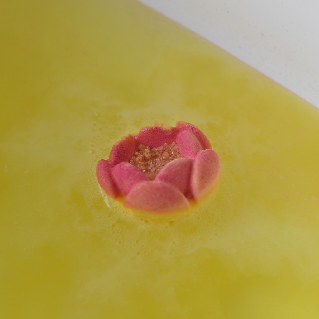 Aruncați bomba în cada umplută cu apă caldă, lăsați-o să se dizolve și bucurați-vă de o baie parfumată și spumantă.