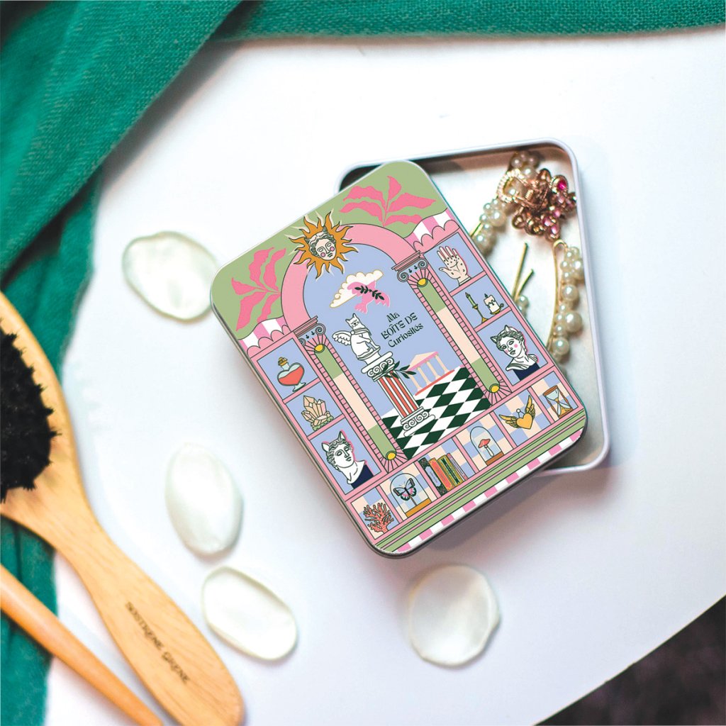 Pătrundeți în poetica cabinet de curiozități, unde fantezia prinde viață în fiecare detaliu. Cutia metalică din colecția Galerie des Songes de la marca Hirondelles & Cie este o mică operă de artă, ce îmbină lumea visătoare a simbolurilor, culorile pastelate delicate și ilustrația originală a talentatei ilustratoare franceze Créa Bisontine.