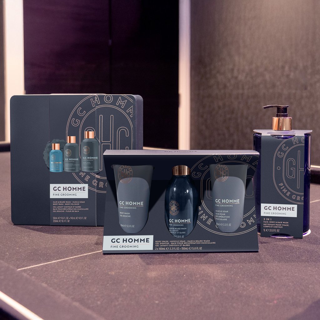 GC Homme reprezintă o colecție perfectă de îngrijire pentru bărbați, care se mândrește cu o culoare albastră elegantă de miezul nopții, cu elemente de cupru și aur, oferind întregii game un aspect îndrăzneț și luxos. Această colecție este concepută cu atenție pentru a satisface nevoile specifice ale bărbaților, incluzând îngrijirea corpului, spălarea părului și a bărbii, igiena corpului și relaxarea musculară. GC Homme atrage o gamă largă de bărbați cu vârsta peste 30 de ani. Parfumul acestei colecții este distinct masculin și picant, cu note de vârf de mandarină, bergamotă și rozmarin, care se îmbină cu o inimă exotică de piper negru, iasomie și scorțișoară, finisată cu o bază bogată de mosc și ambră.