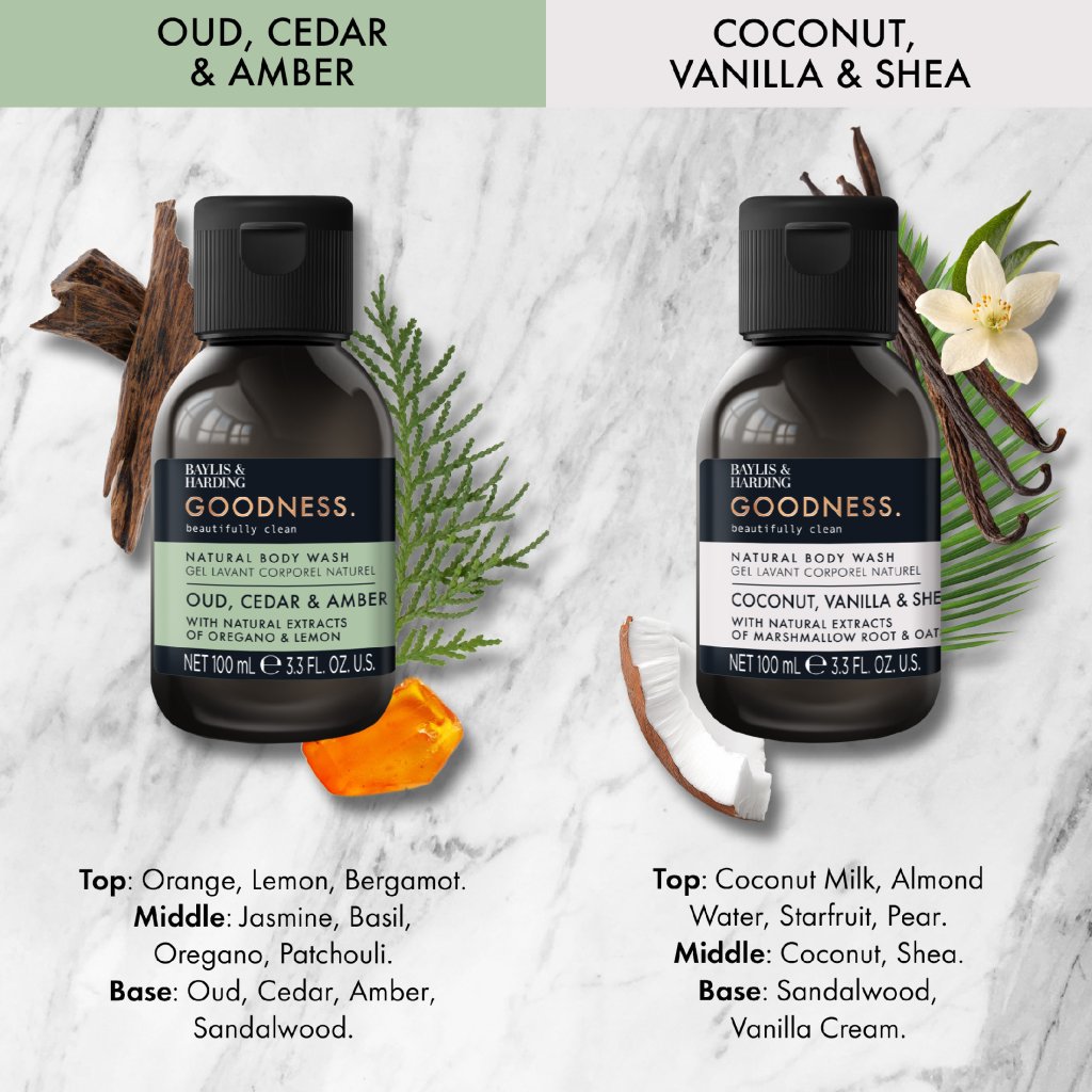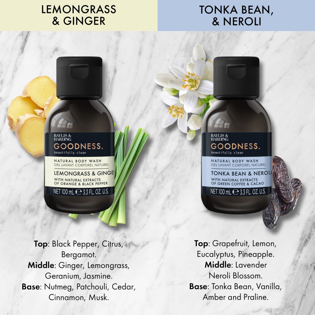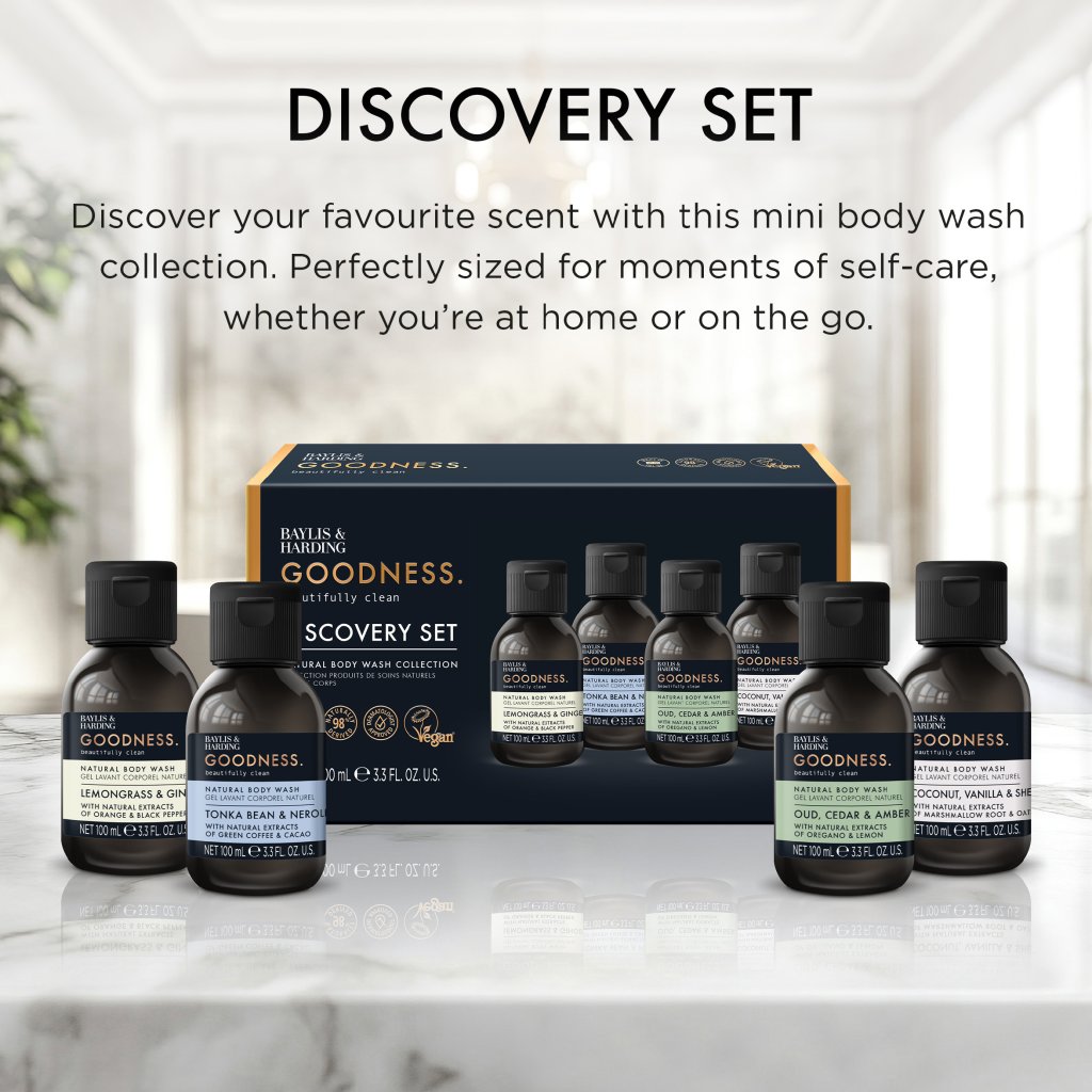 Oferă-ți un moment doar pentru tine și descoperă puterea naturii în colecția de geluri de duș Baylis & Harding Goodness Discovery Collection. Patru arome armonioase, bazate pe ingrediente naturale, vor transforma un duș obișnuit într-un ritual relaxant și vor lăsa pielea fină, catifelată și parfumată. Fiecare gel este îmbogățit cu un amestec unic de uleiuri esențiale și extracte naturale de îngrijire, care vă vor susține starea de spirit în orice moment al zilei – de la revigorarea de dimineață la calmarea de seară. Ambalajele practice de 100 ml sunt ideale pentru a încerca toate aromele, pentru călătorii sau ca un cadou frumos.