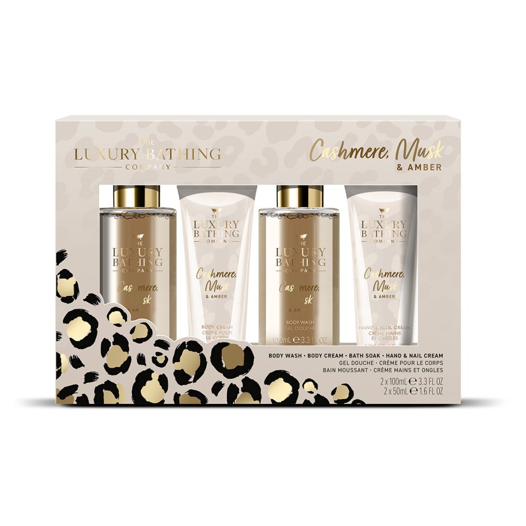 Popis kolekce: Bold animal prints are ever popular from fashion to interiors and beauty, and this trend shows no sign of slowing down. Our Cashmere, Musk & Amber collection is full of vibrancy in a pop of gold and black, against a background of elegant taupe and features a leopard print motif highlighted in gold. This collection is full of gifts to create the perfect night in with velvet cosmetic bags, beautiful tins, and an array of bathtime goodies.