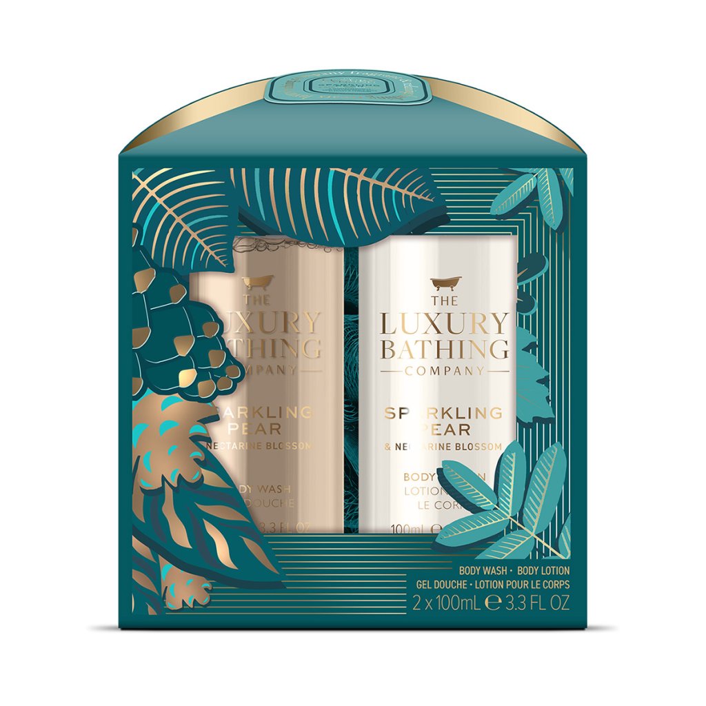 Popis kolekce: Our Sparkling Pear & Nectarine Blossom gift collection provides a decadent bathing experience. With its sophisticated design in pops of gold, turquoise and Green it is both striking and elegant. The collection comprises bath caviar, body cream and body wash for an indulgent bathing experience, and with luxury formats such as patterned velvet gift bags, the range truly brings a hint of glamour to every occasion.