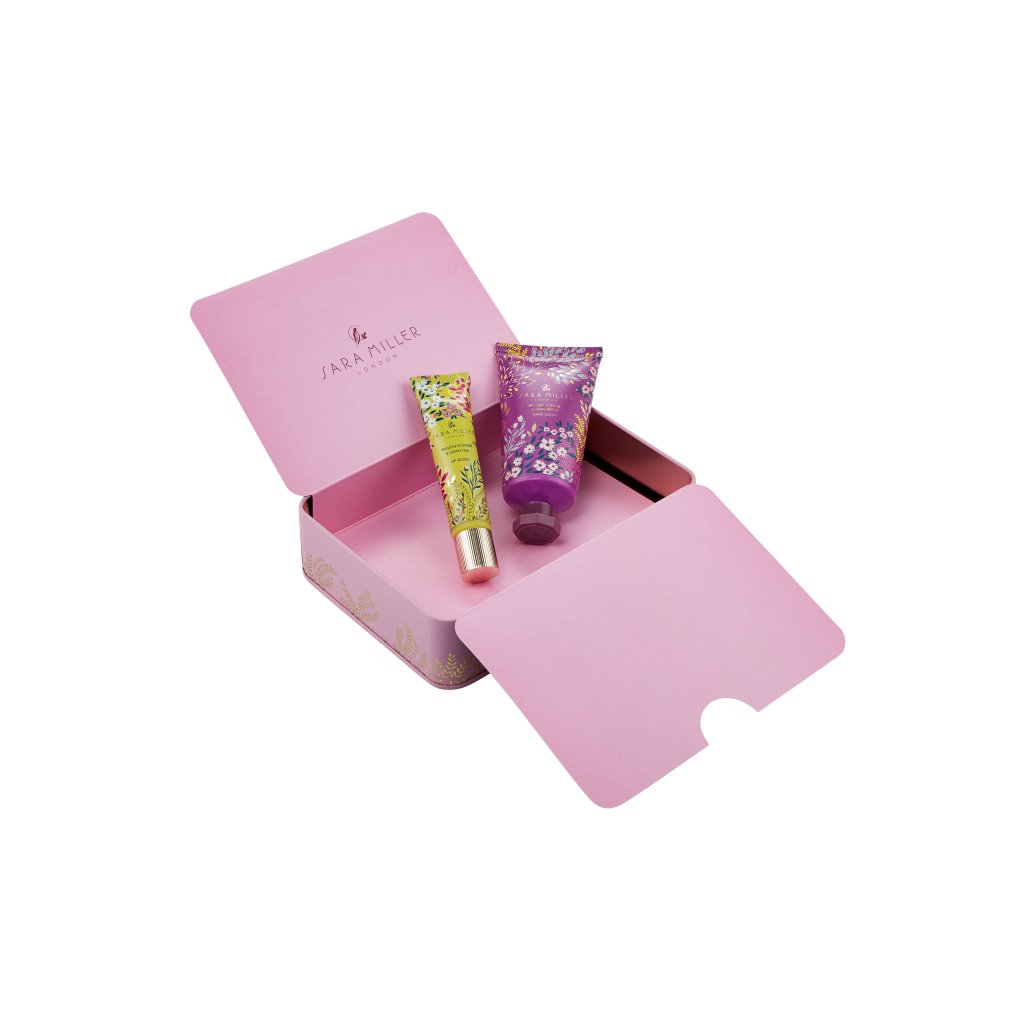 Setul de cadou de lux include cremă de mâini și luciu de buze cu un parfum exotic de floarea pasiunii și plumeria. Într-o cutie de aluminiu semnată de designerul Sara Miller.