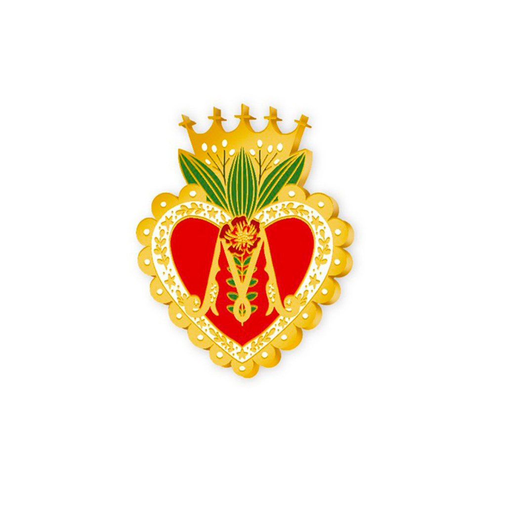 Inițială elegantă, care poartă o poveste personală. Insigna metalică de designer de la marca Hirondelles & Cie combină simbolismul și stilul decorativ distinctiv într-un singur detaliu excepțional. Acest pin emailat sub forma unei inimi decorate cu o coroană, în combinație de roșu și auriu, are un aspect festiv și deosebit.