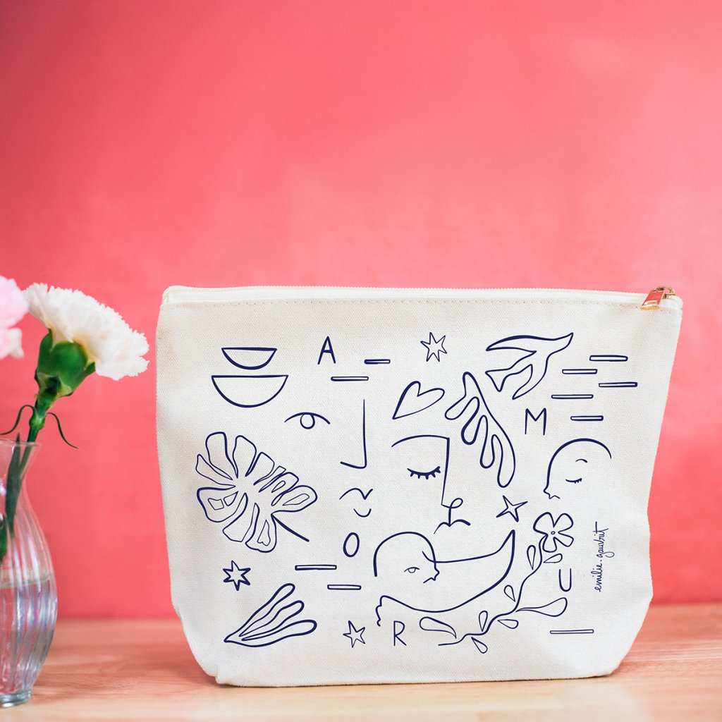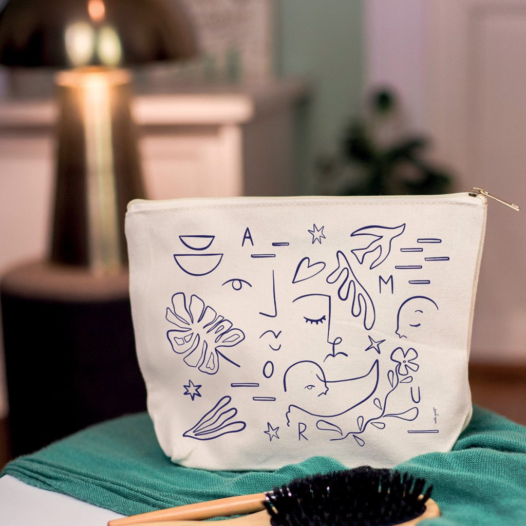 Geanta mare de cosmetice din bumbac, cu o ilustrație minimalistă și motivul „Amour”, este un accesoriu practic și, în același timp, elegant pentru utilizarea zilnică. Desenul autorului Emilie Gauvrit într-un stil liniar fin pare curat, modern și atemporal.
