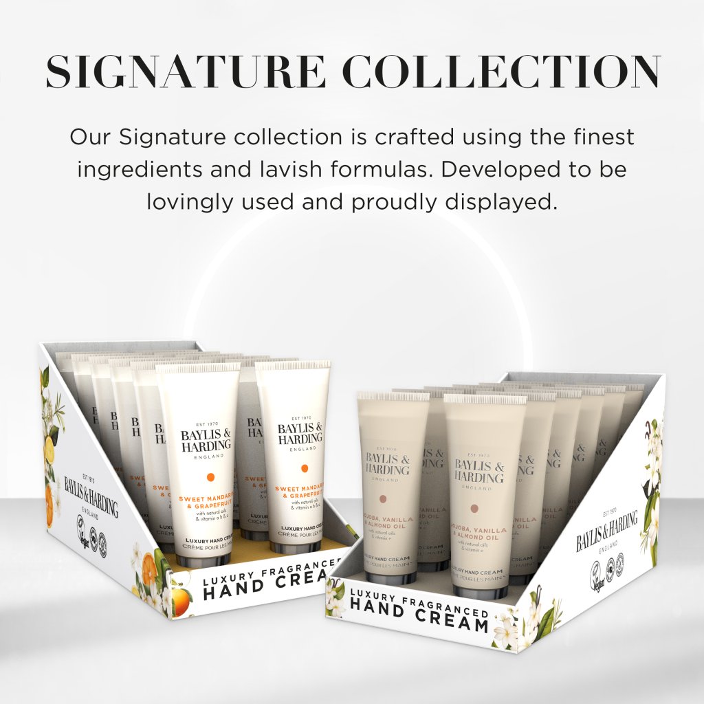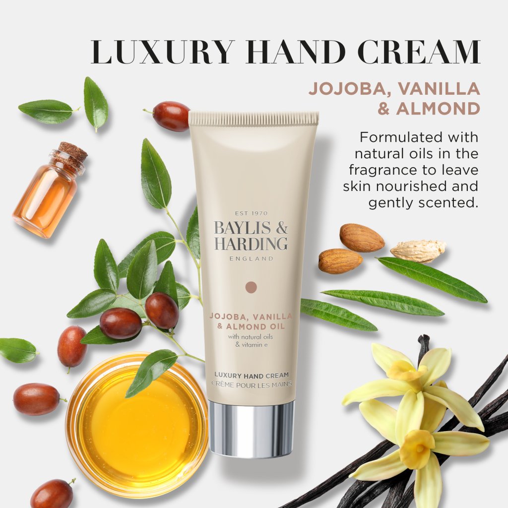 Oferiți mâinilor dumneavoastră o doză zilnică de lux cu crema de mâini Baylis & Harding Jojoba, Vanilie și Ulei de migdale.