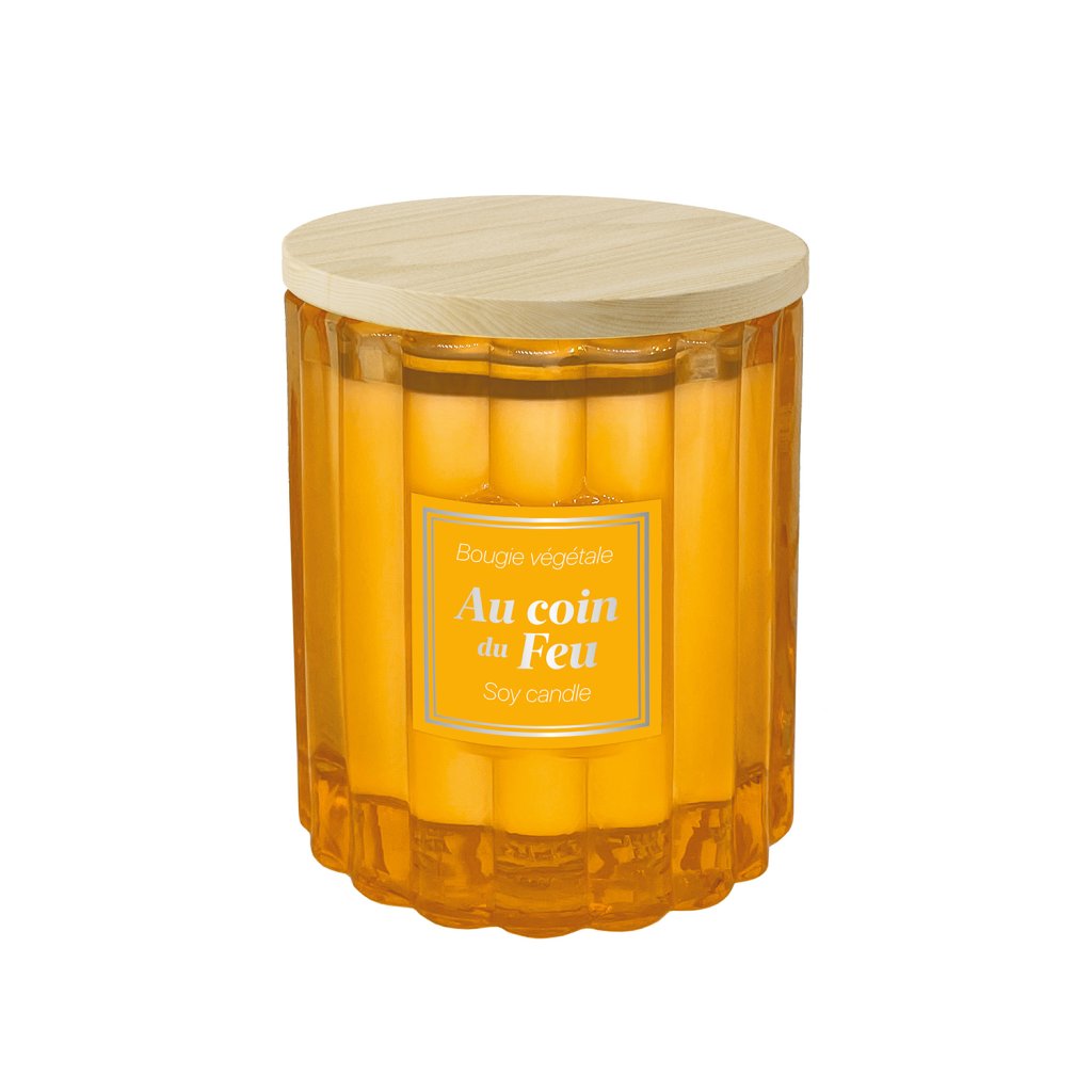 Lumânarea este așezată cu grijă într-un pahar elegant, canelat, cu un capac frumos din lemn de fag, care adaugă o notă de lux natural.