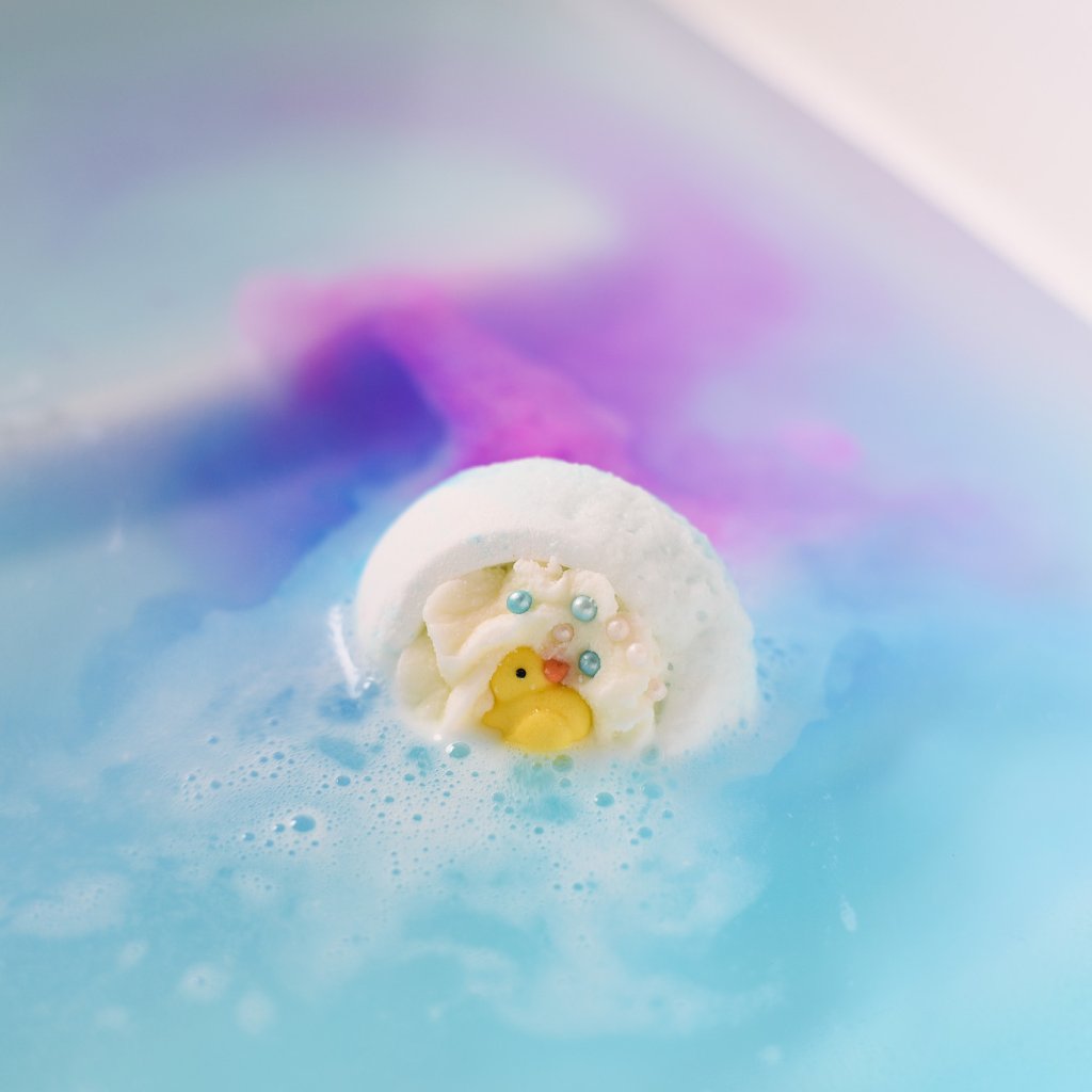 Bomba efervescentă veselă, cu design de rățușcă, transformă fiecare baie într-o relaxare jucăușă și parfumată. Bomba colorează ușor baia și o îmbogățește cu unt de cacao și ulei de migdale, care hrănesc pielea și o lasă moale și suplă. Uleiurile esențiale de patchouli și lemn de santal ajută la crearea unei senzații de echilibru și liniște.