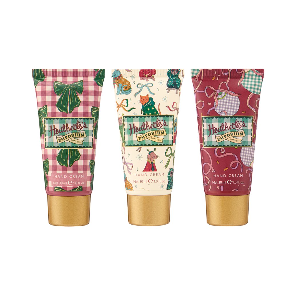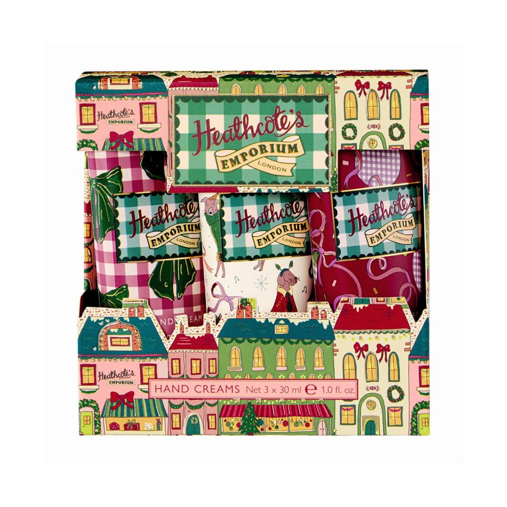 Setul de lux Heathcote’s Emporium conține trei creme de mâini în format de călătorie, decorate cu motive pictate manual, inspirate de vitrinele de Crăciun, funde roșii și animale de companie în pulovere de iarnă. Un cadou perfect care combină farmecul nostalgic al Crăciunului cu stilul modern.