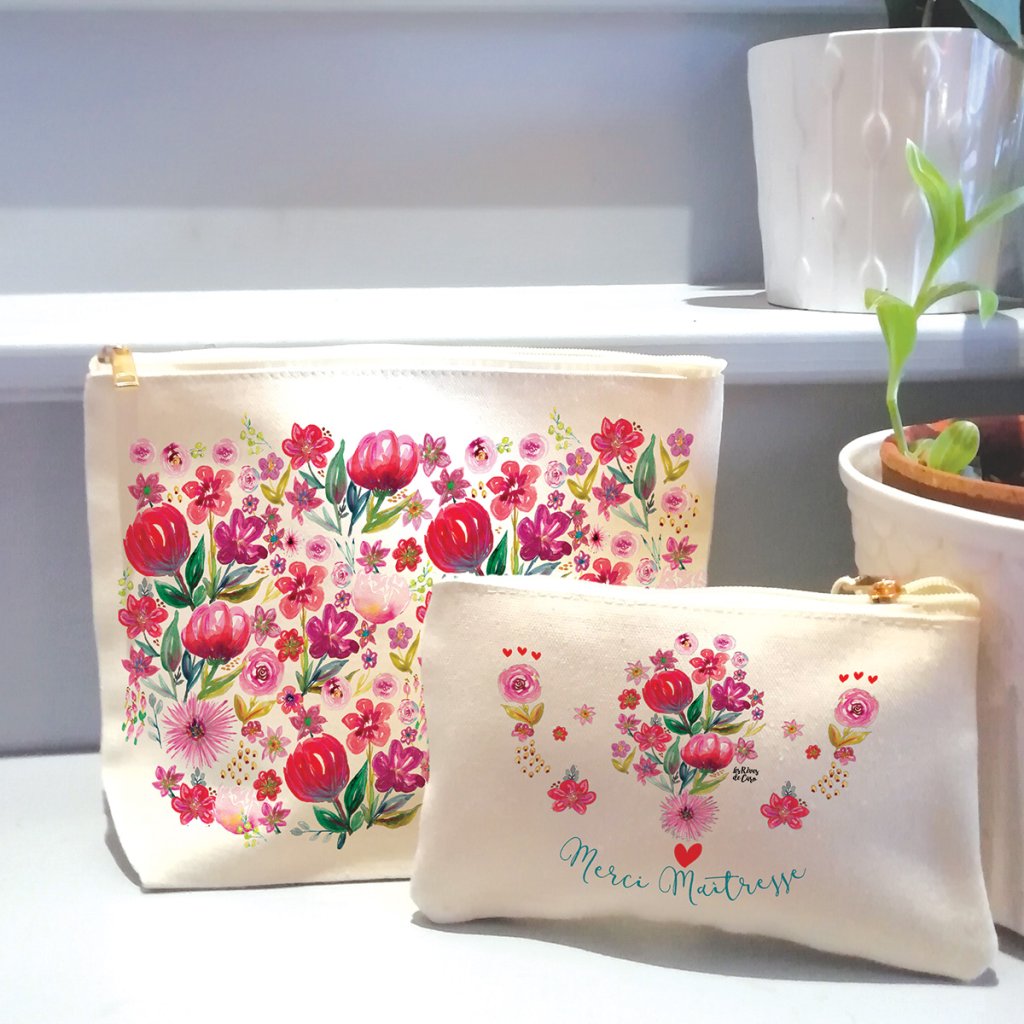 O mică trusă de machiaj cu inscripția Merci maîtresse "Mulțumesc, doamnă învățătoare" de la marca franceză Hirondelles & Cie este decorată cu un frumos motiv floral pictat în acuarelă.