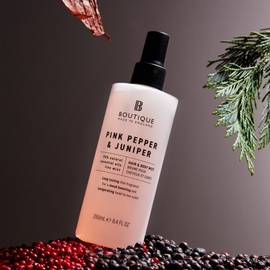 Oferă energie pielii oricând în timpul zilei cu spray-ul revigorant Boutique Pink Pepper & Juniper. O ceață ușoară parfumează delicat pielea și părul cu un parfum picant îndrăzneț, în care se îmbină piperul roz și ienupărul cu notele calde de chiparos, tutun și lemn de santal. Datorită uleiului de boabe de ienupăr, oferă o senzație de relaxare și susține vitalitatea, în timp ce glicerina și acidul lactic hidratează, catifelează și luminează pielea. Potrivit și pentru pielea sensibilă, ideal pentru un impuls zilnic.