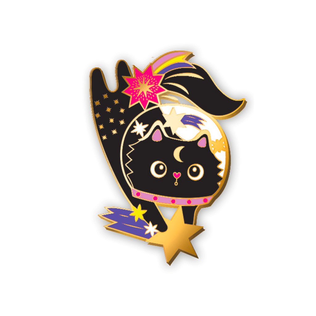 Designový kovový odznáček s motivem kočky v kosmu jako originální módní doplněk.