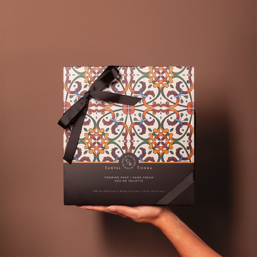 Un set elegant inspirat de tradiția portugheză și de aromele orientale calde ascunde un săpun spumant care curăță delicat pielea, o cremă de mâini pentru o piele hidratată și fină și o mini apă de toaletă ideală pentru călătorii. Întreaga colecție este însoțită de note senzuale de lemn de santal și boabe de tonka.