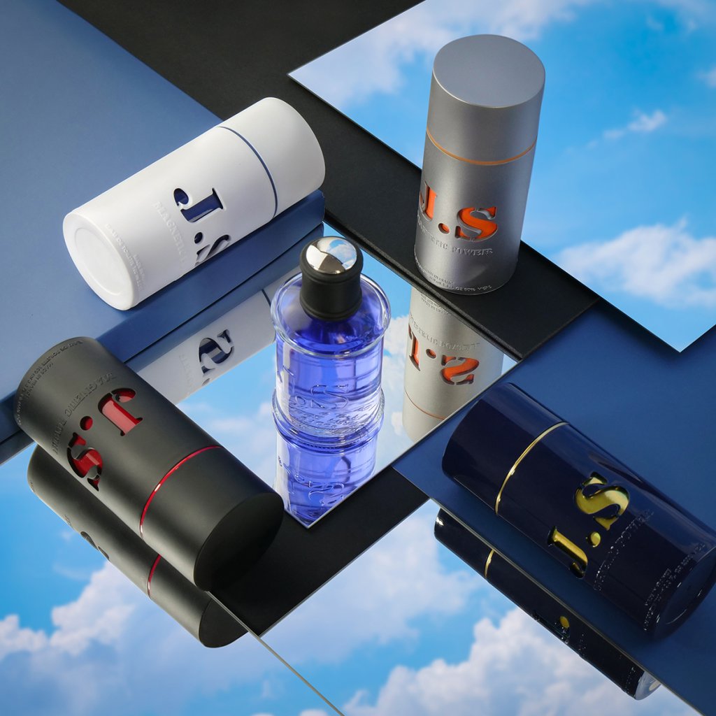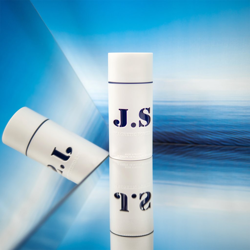 Sticluța parfumului are un aspect modern și minimalist cu un finisaj mat alb. Inscripția albastră J.S. contrastează puternic cu fundalul curat, conferind sticluței un aspect elegant și sofisticat. Capacul magnetic inovator adaugă un element practic și stilat, evidențiind eleganța generală a designului.
