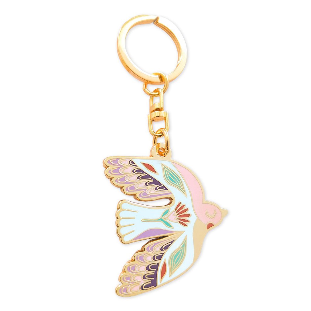 Un breloc de designer în formă de rândunică de la marca franceză Hirondelles & Cie este un accesoriu elegant pentru chei, geantă sau rucsac. Motivul este realizat din metal cu finisaj auriu și completat cu detalii emailate. Brelocul este echipat cu un inel metalic solid pentru atașare ușoară.