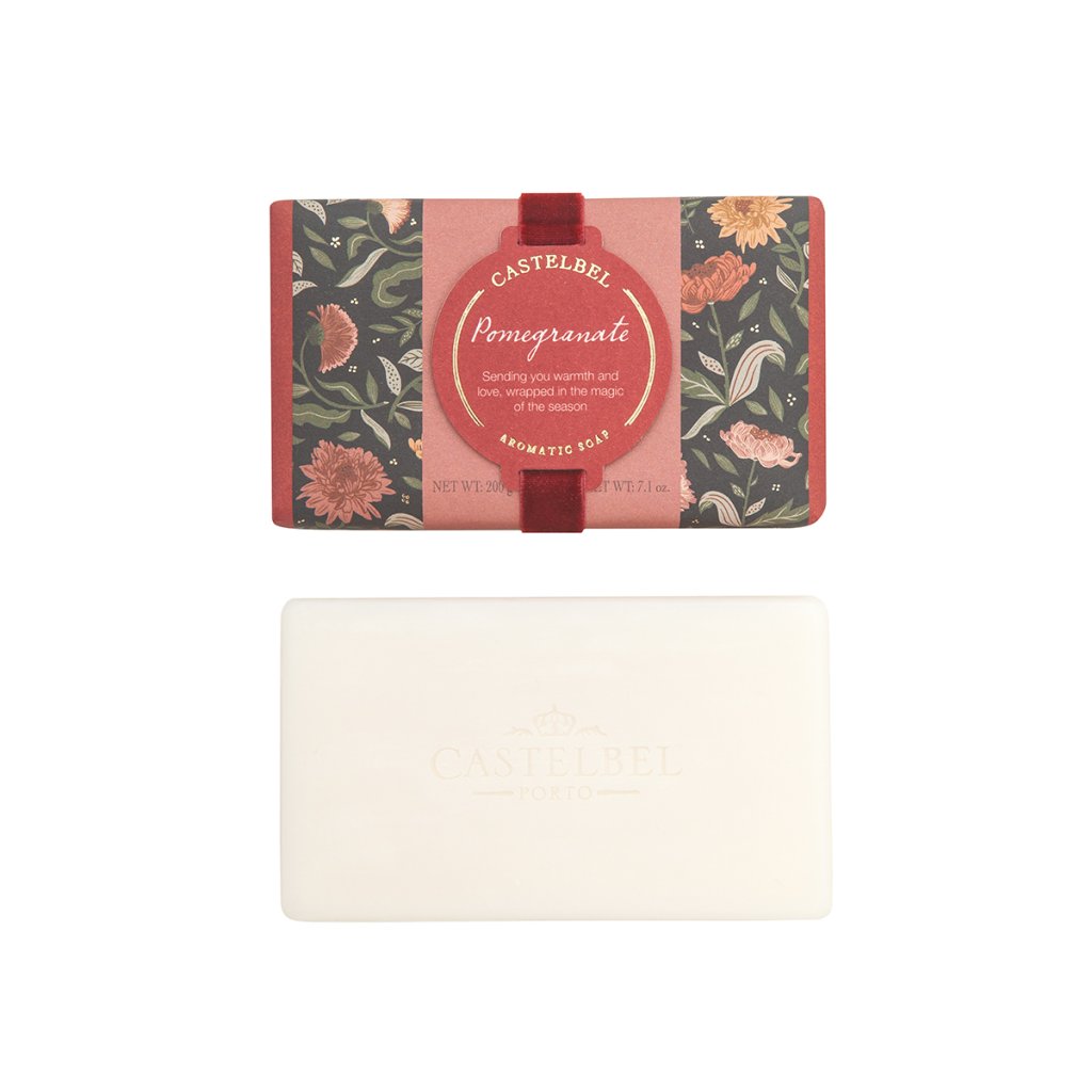 Castelbel Pomegranate este un săpun premium ambalat într-o hârtie elegantă cu motiv floral și decorat cu o panglică de catifea. Arată luxos la prima vedere – iar parfumul său este și mai bun. Un amestec de rodie suculentă, coacăze, trandafir și mosc cald creează o senzație de confort, bunăstare și atmosferă de iarnă.