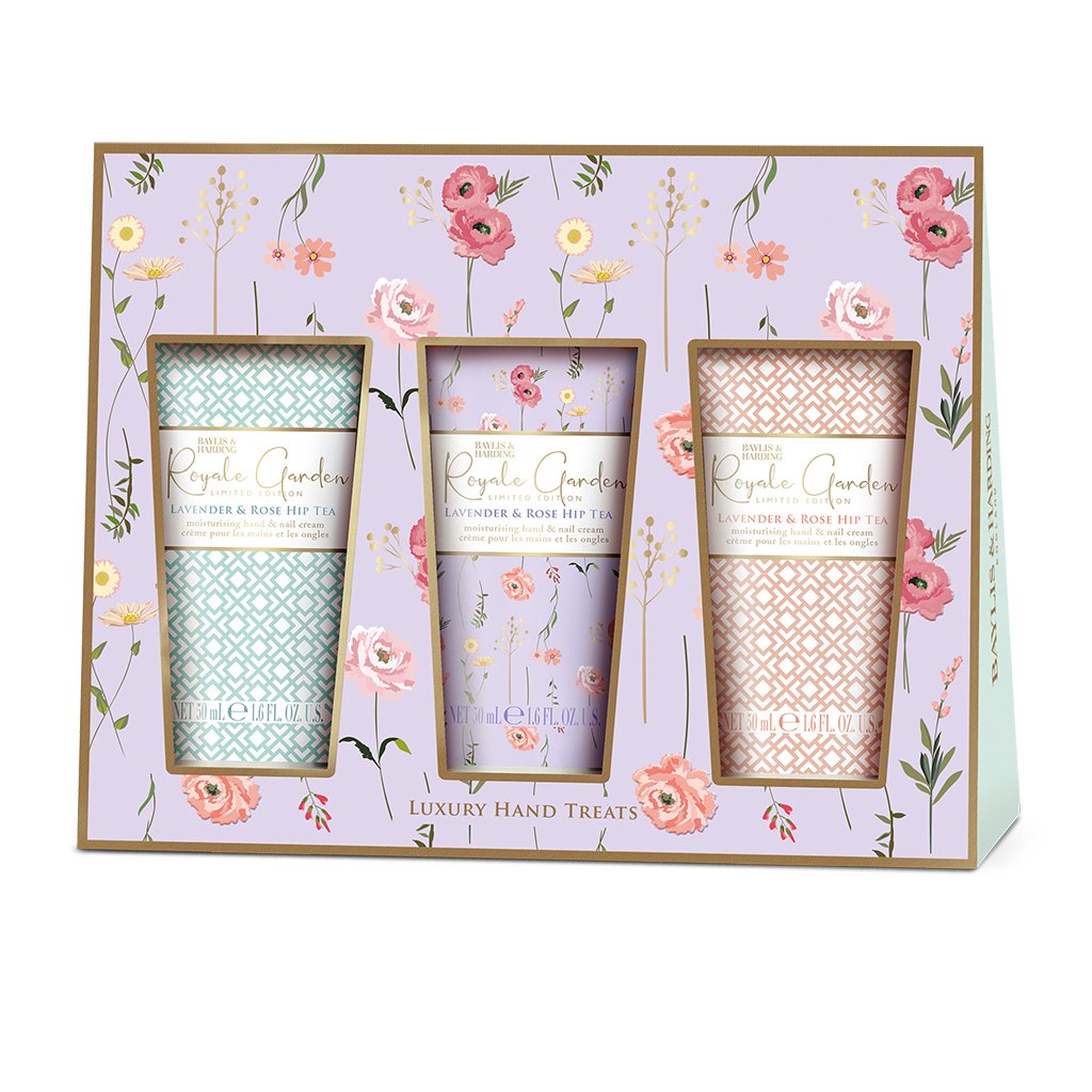 Royale Garden reprezintă o colecție romantică inspirată de grădina tradițională englezească. Combină motive florale cu tonuri pastelate de violet și mentă, completate de detalii aurii. Designul floral și parfumul delicat de lavandă și măceșe creează o colecție delicată de produse de îngrijire pentru fiecare femeie.