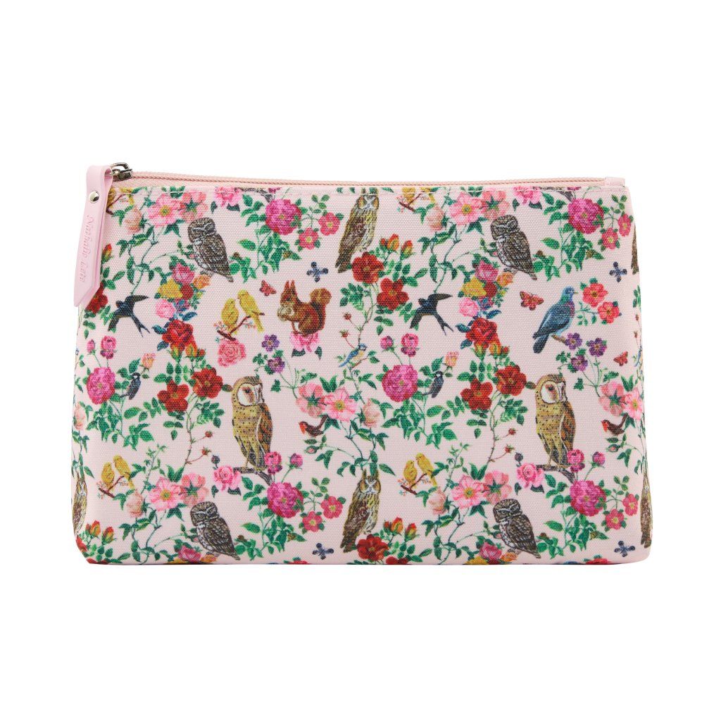 Geantă cosmetică superbă cu decorații din natură, conținând produse de îngrijire.