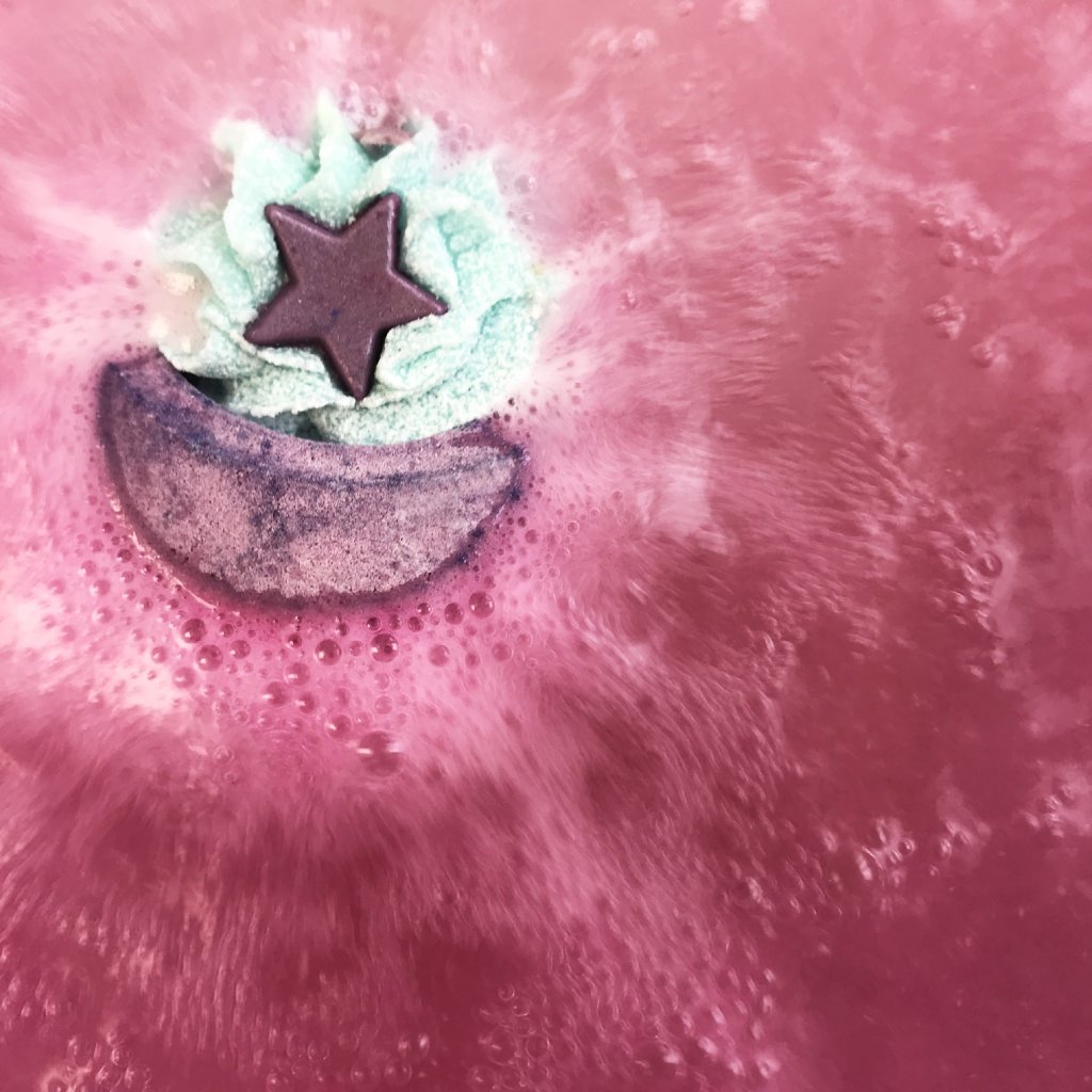 Aruncați bomba în cada umplută cu apă caldă, lăsați-o să se dizolve și bucurați-vă de o baie parfumată și spumantă.