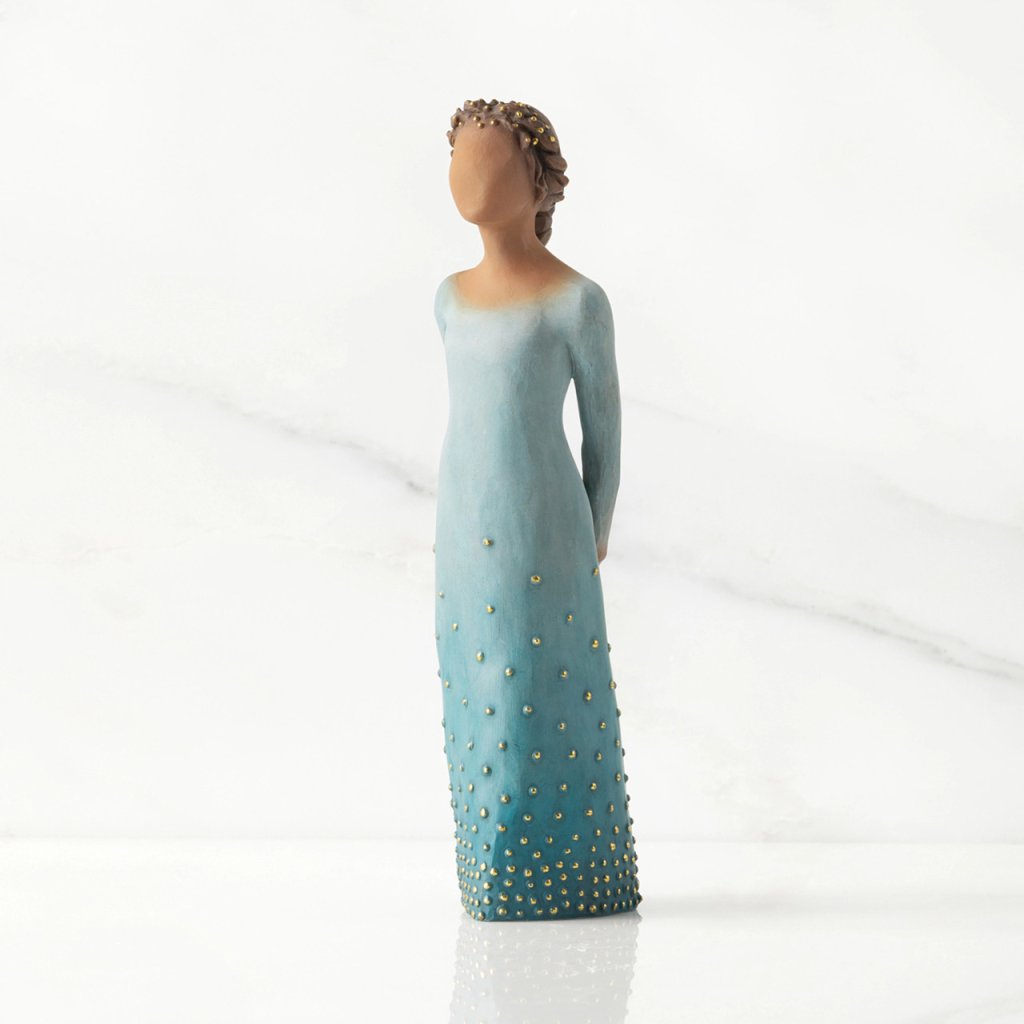 O figurină frumoasă înfățișează o femeie încrezătoare, îmbrăcată într-o rochie albastră, cu mâinile la spate.