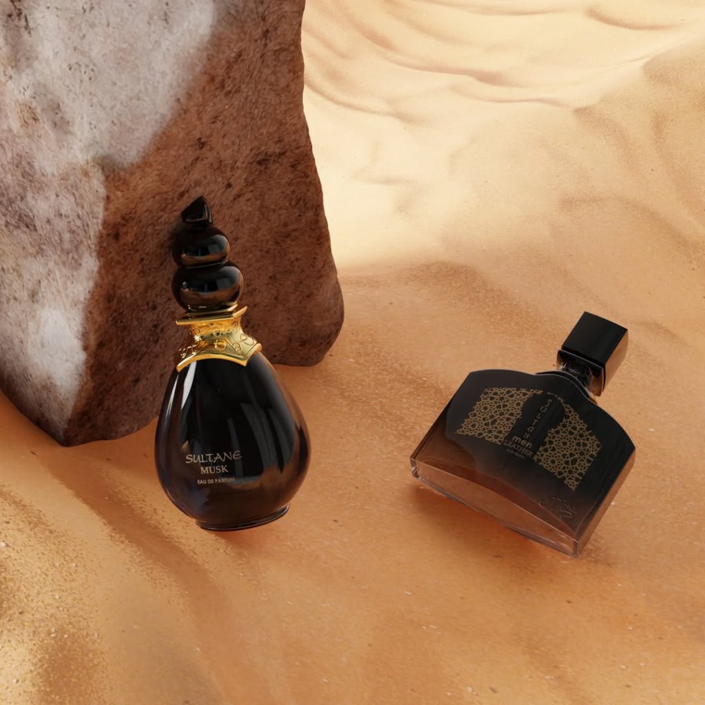 - Sticla: Flaconul Sultane Musk amintește de o bijuterie orientală prețioasă – albastrul său safir profund evocă cerul misterios de noapte, în timp ce detaliile aurii adaugă o notă luxoasă parfumului. Capacul negru elegant, în formă de arabesc, subliniază caracterul exotic al parfumului.