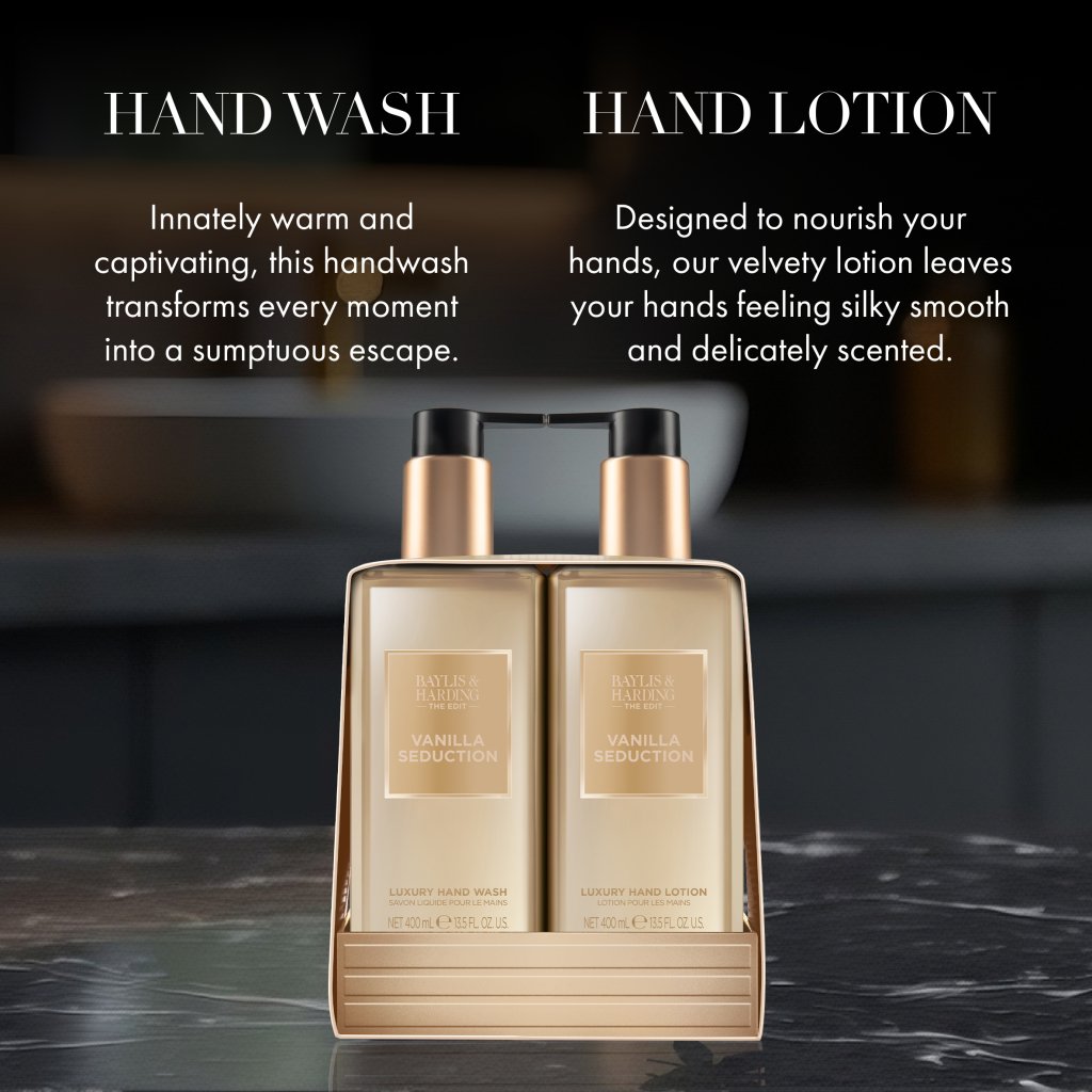 Transformați spălarea zilnică a mâinilor într-un ritual senzual cu acest set cadou elegant Baylis & Harding Vanilla Seduction. Într-un ambalaj auriu superb se ascunde un săpun lichid de lux pentru mâini și un lapte de mâini fin catifelat, care oferă pielii tale o îngrijire excepțională și un parfum captivant. Vor lăsa mâinile moi, hidratate și frumos parfumate.