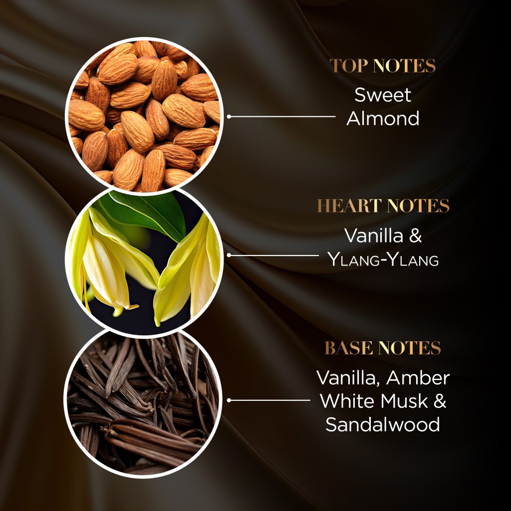 - parfum senzual de vanilie, migdale, ylang-ylang, ambră și mosc