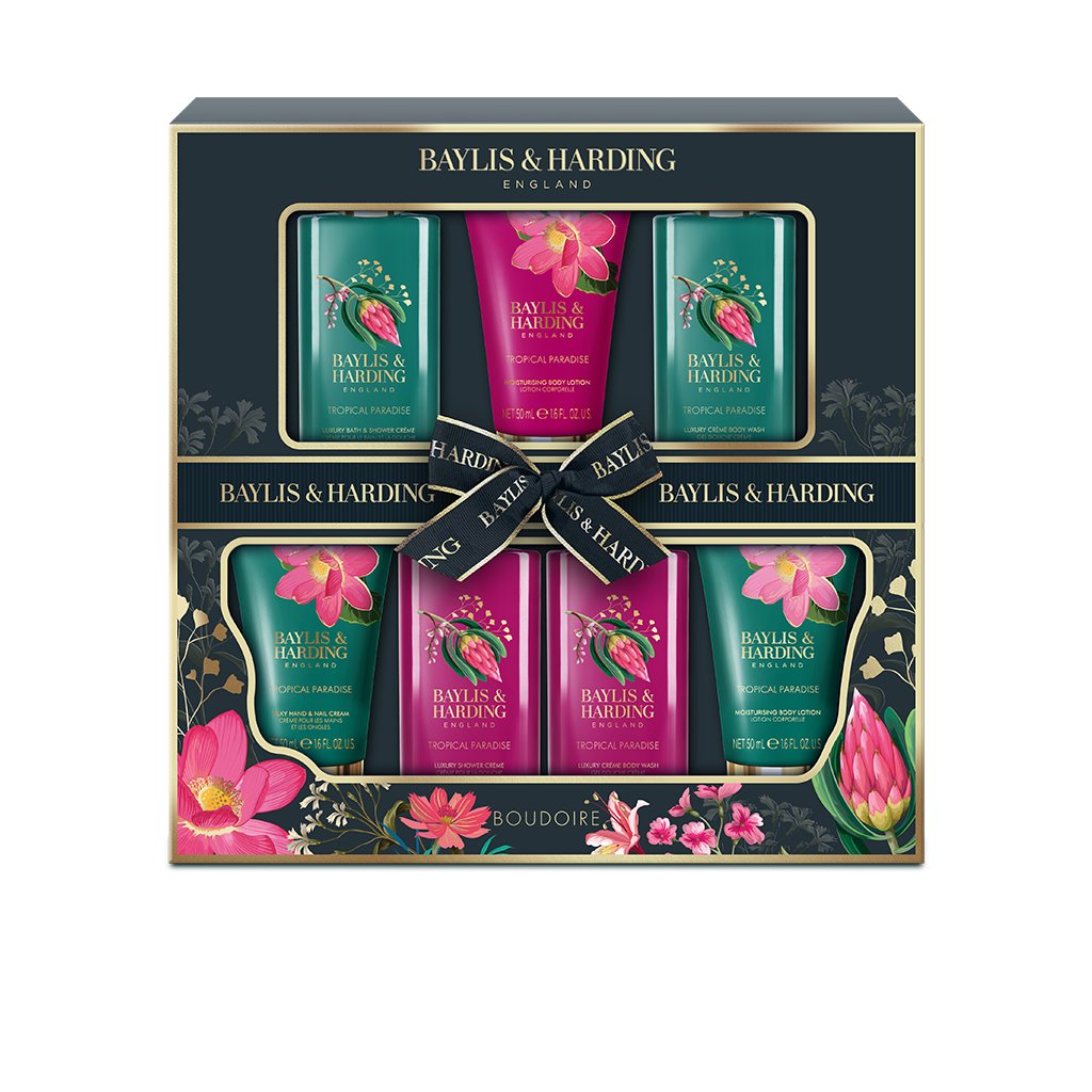 Colecția la modă Boudoire - Tropical Paradise aduce un design floral exotic cu o notă modernă și un strop de lux. O paletă îndrăzneață de roz fucsia și verde smarald este completată de detalii aurii, care conferă întregii game un caracter excepțional. Produsele de îngrijire și seturile cadou minunate sunt însoțite de un parfum tropical de banane, piersici și flori de portocal.