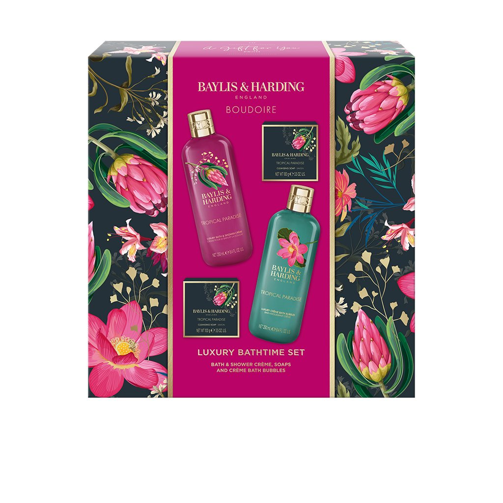 Colecția la modă Boudoire - Tropical Paradise aduce un design floral exotic cu o notă modernă și un strop de lux. O paletă îndrăzneață de roz fucsia și verde smarald este completată de detalii aurii, care conferă întregii game un caracter excepțional. Produsele de îngrijire și seturile cadou minunate sunt însoțite de un parfum tropical de banane, piersici și flori de portocal.