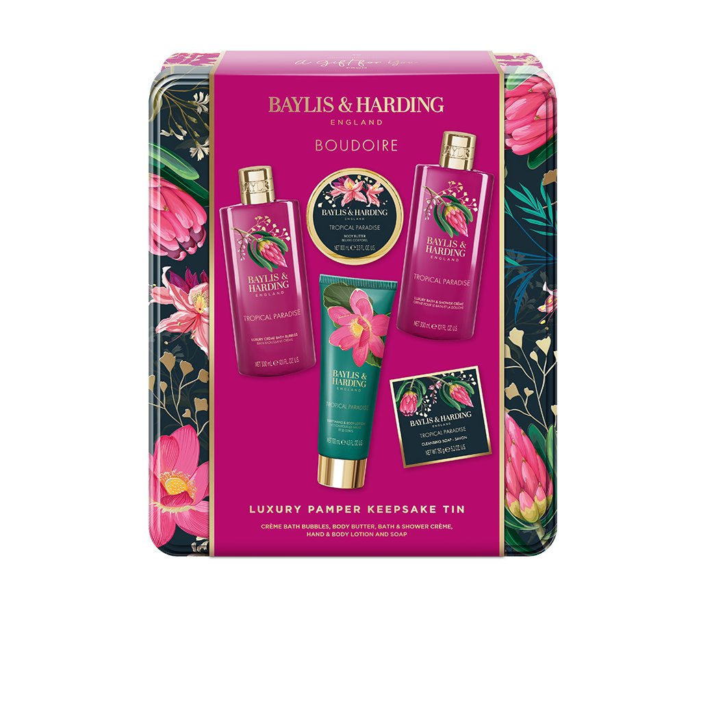 Colecția la modă Boudoire - Tropical Paradise aduce un design floral exotic cu o notă modernă și un strop de lux. O paletă îndrăzneață de roz fucsia și verde smarald este completată de detalii aurii, care conferă întregii game un caracter excepțional. Produsele de îngrijire și seturile cadou minunate sunt însoțite de un parfum tropical de banane, piersici și flori de portocal.