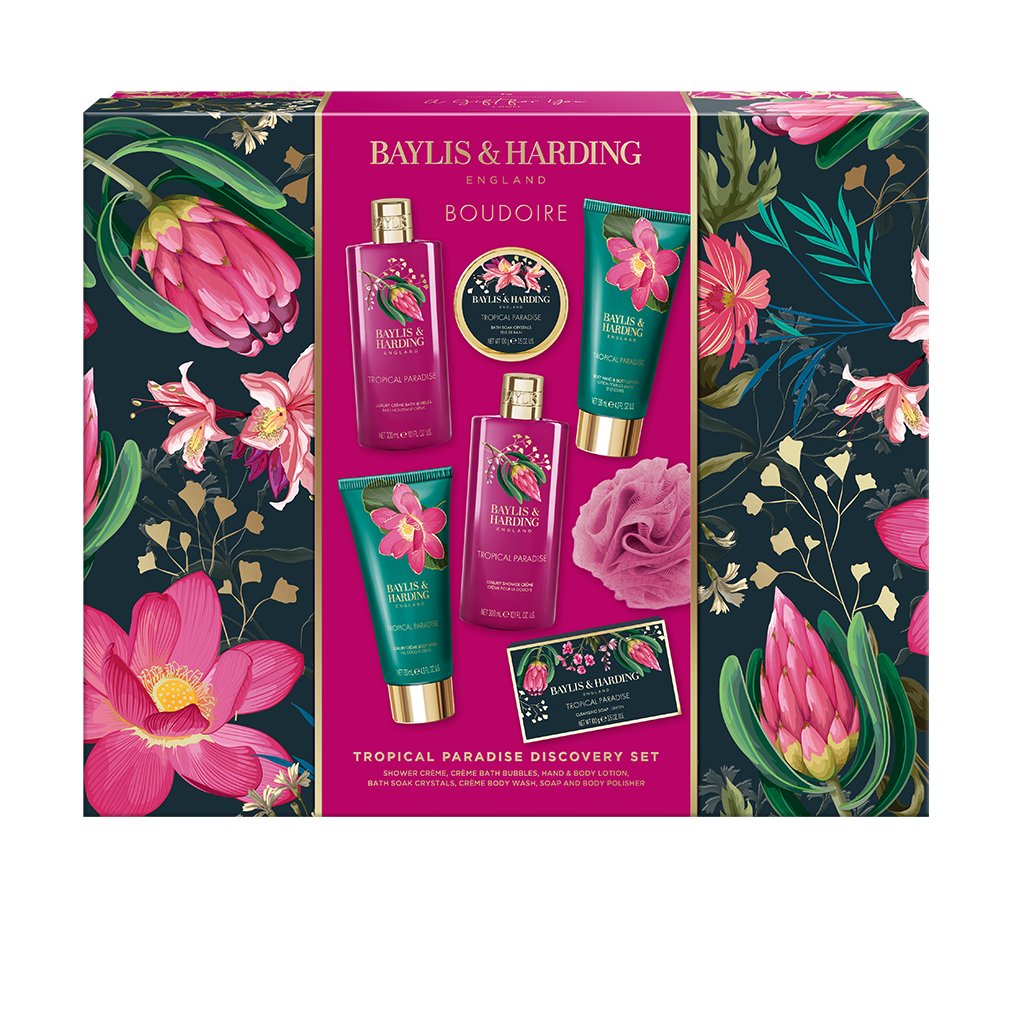 Colecția la modă Boudoire - Tropical Paradise aduce un design floral exotic cu o notă modernă și un strop de lux. O paletă îndrăzneață de roz fucsia și verde smarald este completată de detalii aurii, care conferă întregii game un caracter excepțional. Produsele de îngrijire și seturile cadou minunate sunt însoțite de un parfum tropical de banane, piersici și flori de portocal.