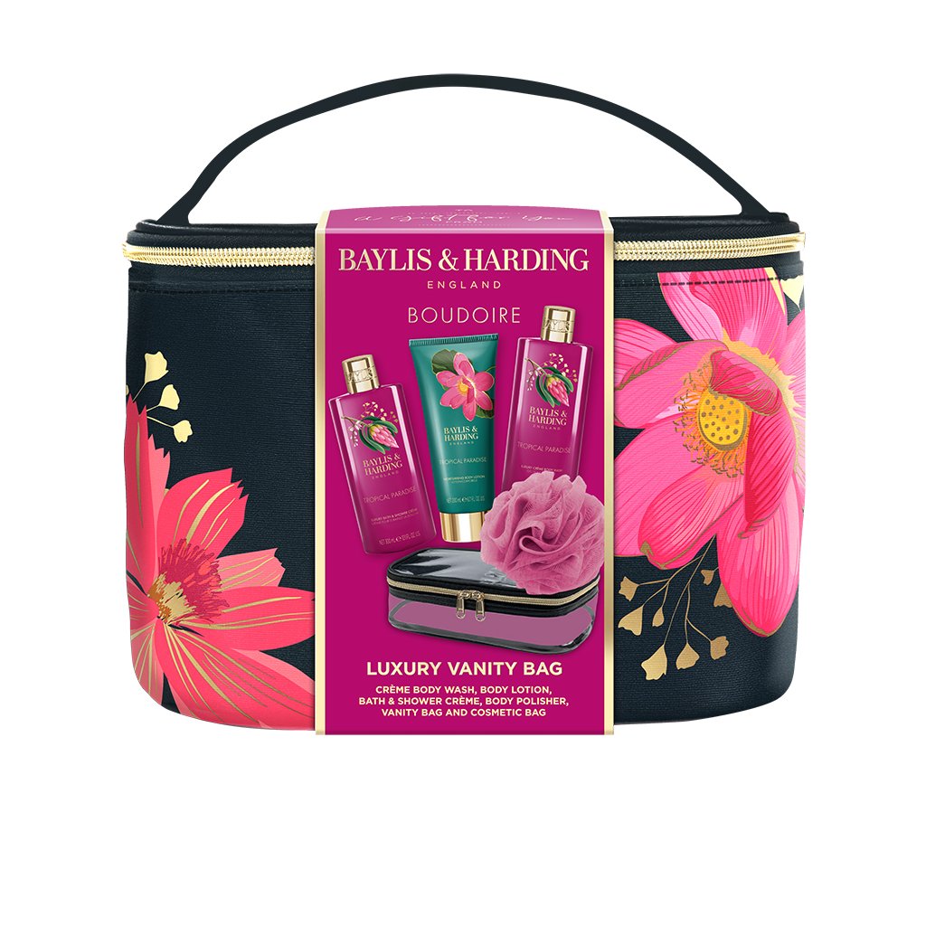 Colecția la modă Boudoire - Tropical Paradise aduce un design floral exotic cu o notă modernă și un strop de lux. O paletă îndrăzneață de roz fucsia și verde smarald este completată de detalii aurii, care conferă întregii game un caracter excepțional. Produsele de îngrijire și seturile cadou minunate sunt însoțite de un parfum tropical de banane, piersici și flori de portocal.