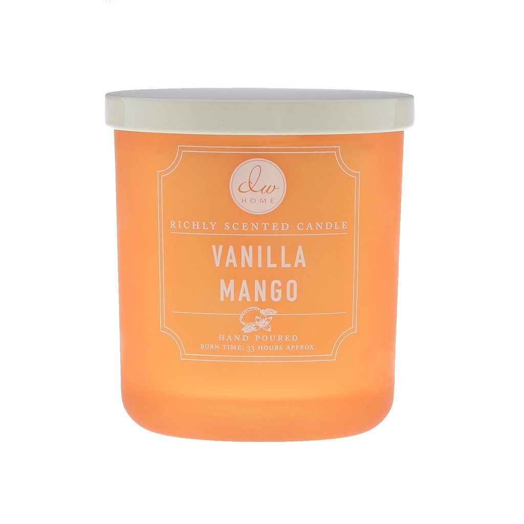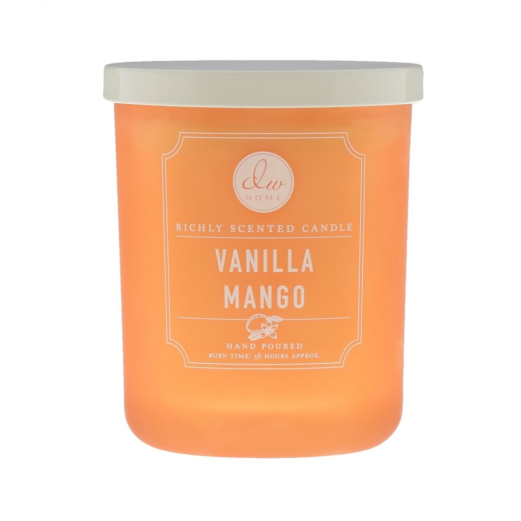 Lumânare parfumată în pahar cu parfum de mango dulce, înmuiat cu păstaie de vanilie și frișcă.
