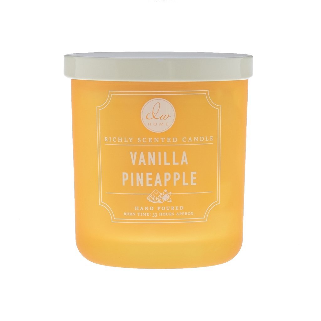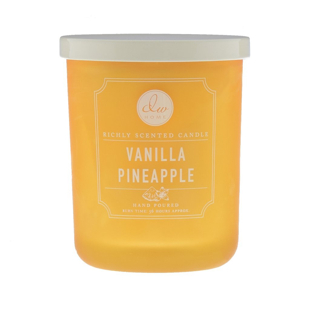 Lumânare parfumată în pahar cu parfum de ananas tropical copt la soare, intercalat cu păstaie dulce de vanilie și frișcă.