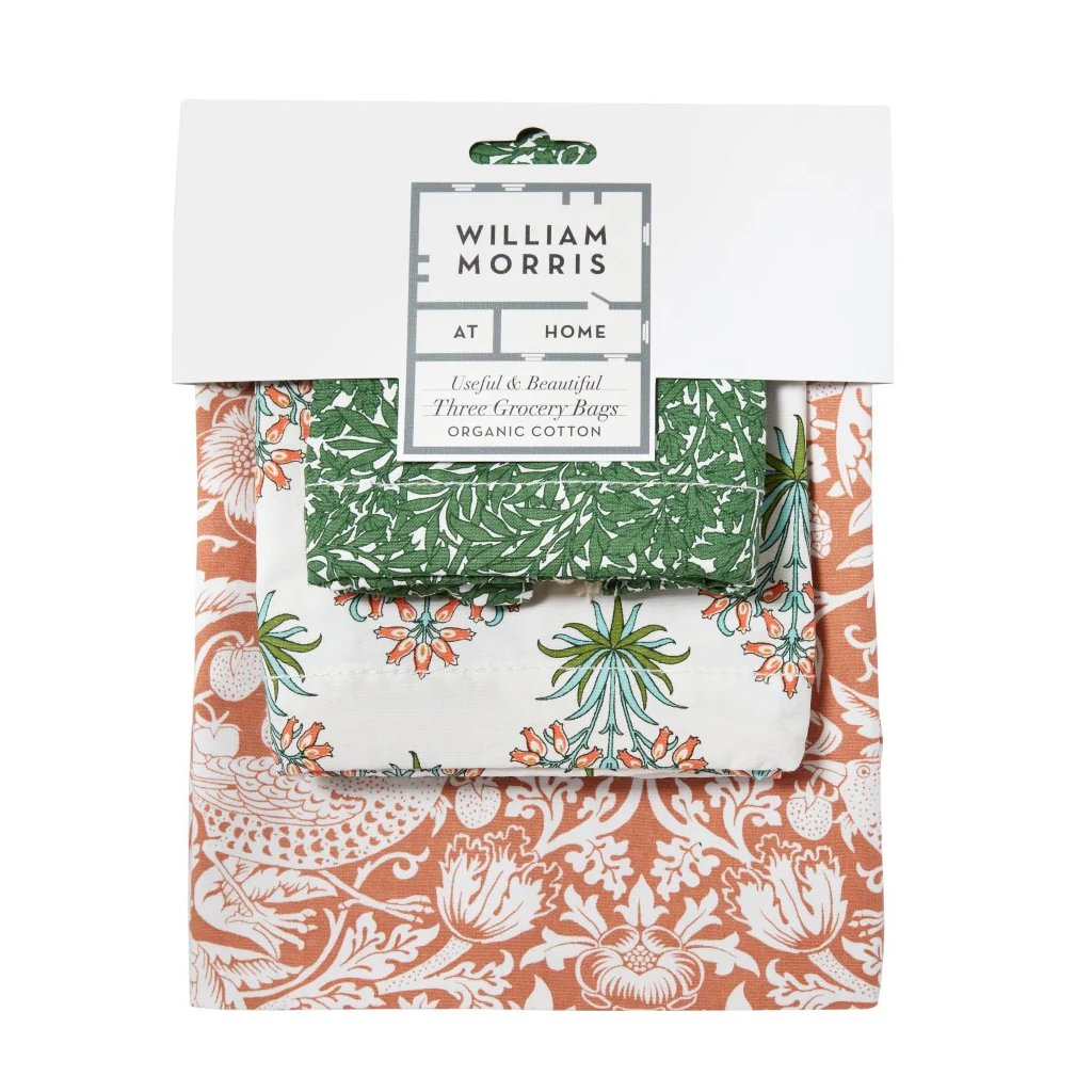 Adăugați eleganță și sustenabilitate activităților de zi cu zi cu acest set de trei genți din bumbac organic, inspirate de modelele iconice ale lui William Morris. Aceste genți practice și frumoase sunt imprimate cu cerneluri ecologice, astfel încât să vă puteți transporta cumpărăturile ținând cont de mediul înconjurător. Setul include trei dimensiuni, care sunt perfecte pentru cumpărături, depozitarea produselor cosmetice, a pantofilor sau a articolelor creative. Fiecare dintre aceste piese atemporale este decorată cu un model unic din galeria William Morris – Strawberry Thief, Foliage și Hyacint. Include și un șnur practic de strângere.